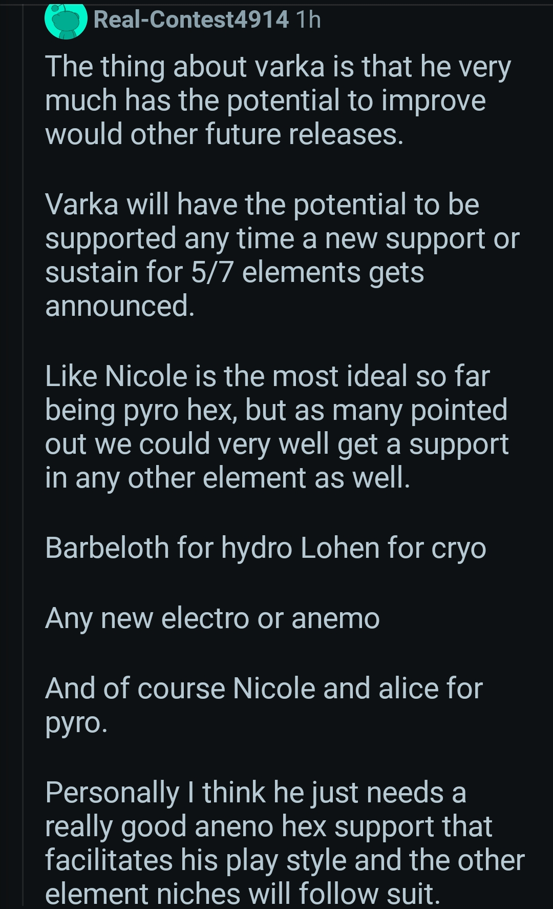 >>559858443>He's litterty not bad if you invest in him it's like raidan Raiden needed to be at least c2 or 3 too be good if you c6 varka and get his weapon you can beat any fight in the game he's also the most flexible character in the game that can run multiple teams and artifacts I just beat the abyss with him using a electro team and succrose >unironic c3r1 raiden is good investment postingis reddit the new 4chan?