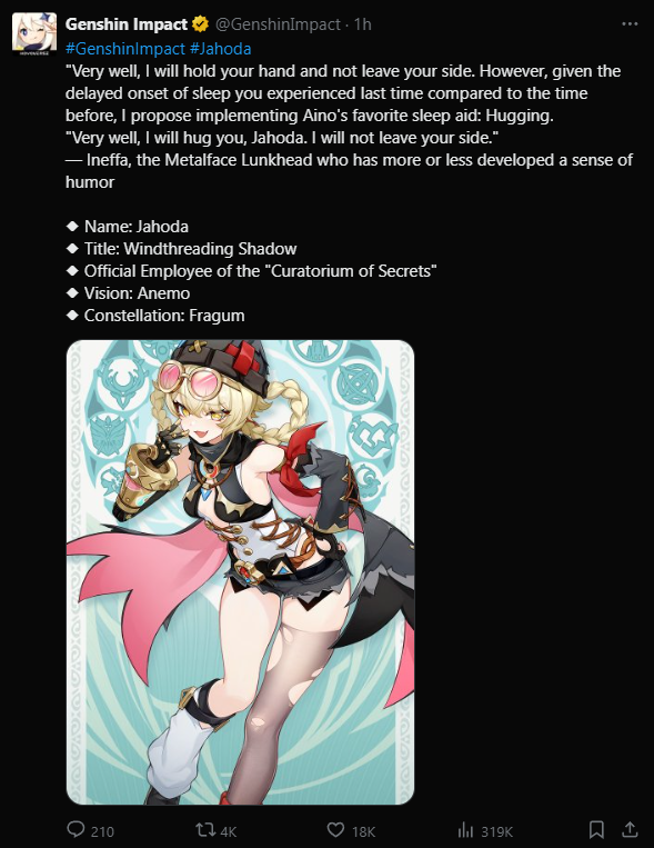 Previous: >>559841627>Character Trailer - "Varka: The Code of Chivalry"https://youtu.be/_Q-i5CA0ogM (EN)https://youtu.be/NLZad3MENnA (JP)>Character Teaser — "Varka: Where the Knight's Heart Leads"https://youtu.be/fpNygi8Vd0A (EN)https://youtu.be/GAqgp1JMjKo (JP)>"Another Prologue" Animated Shorthttps://youtu.be/4s7G9I4SGZc (EN)https://youtu.be/waZgLGxJN6E (JP)>Version "Luna V" "Homeward, He Who Caught the Wind" Trailerhttps://youtu.be/p02WXZZ84M4 (EN)https://youtu.be/V30u55XoYrE (JP)>Current character banner: Varka, Flins, Sucrose, Xiangling, Bennett>Current weapon banner: Gest of the Mighty Wolf (Claymore), Bloodsoaked Ruins (Polearm)https://www.hoyolab.com/article/43911910>Daily check-in rewards (permanent)https://webstatic-sea.mihoyo.com/ys/event/signin-sea/index.html?act_id=e202102251931481&lang=en-us>Redeemable Codes with Primogems (all regions): https://genshin.mihoyo.com/en/giftGENSHINGIFT8BHA0KFRG94K8X73KH58KDHNJTSHBHPPKUSVLTT3DVKVLUQZ (NEW)>Useful Links (Wiki, Simulators, Maps, Character Builds, /gig/ friendlist, Third-Party Tools, etc.)https://rentry.org/giglinks/gig/ OP pastebin (use this if making new thread):https://pastebin.com/ca0zseQ9