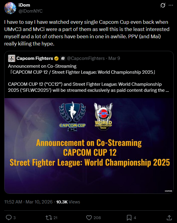 I think I speak for all of us when I say we will HAPPILY pay $10 to watch the best players in the world compete in Capcom Cup