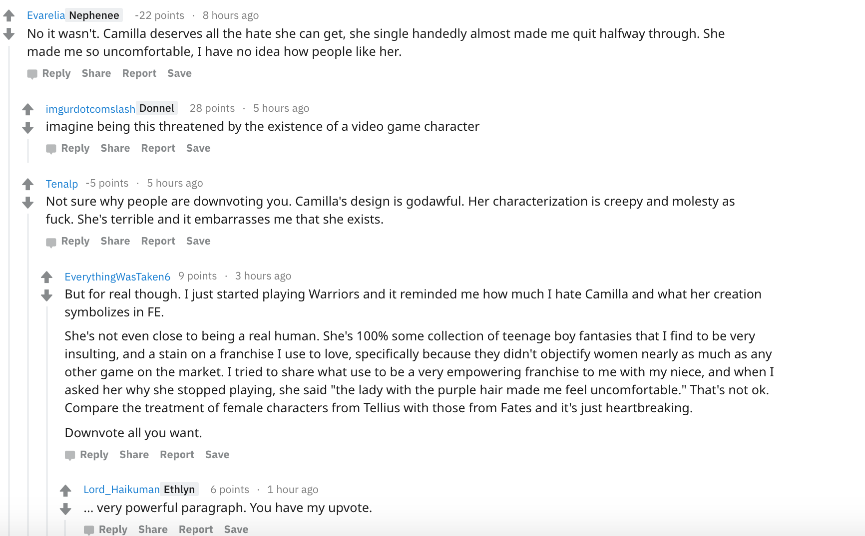 The most you can say about Camilla is that you have feelings of lust for her. You can't pretend that she has any character to speak of because it's nonexistent. A doting sibling is a trait that practically every one of the royals share minus Takumi. So that leaves just her looks which are quite frankly overrated. She has a weird face, and doesnt even have the biggest breasts in the game. Not that boob size = better girl because Elise is honestly hotter than the purple haired bimbo.