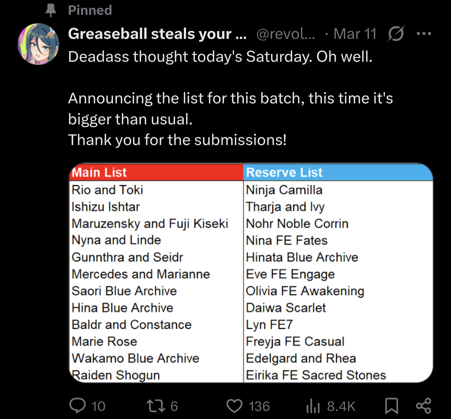 >>560264812>Nyna and Linde>Gunnthra and Seidr>Mercedes and Marianne>Baldr and Constance>Ninja Camilla>Tharja and Ivy>Good Corrin>Nina>Eve>Olivia>Lyn>Freyja>Edelgard AND Rhea>EirikaPretty fucking based list. And this is in addition to whatever Tsubasa stuff he does at CYL and Shadows Cup, as well as the Book 7 TT+.