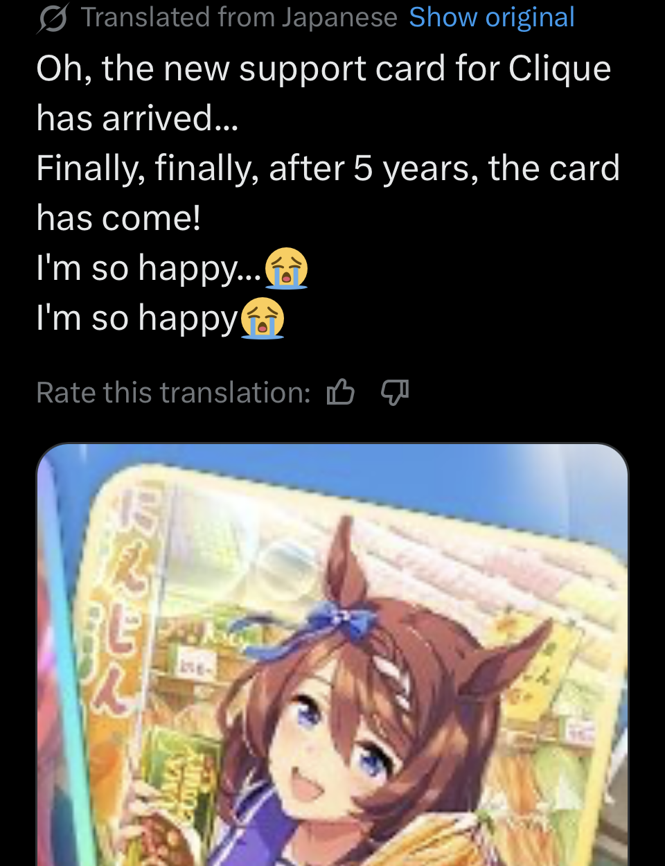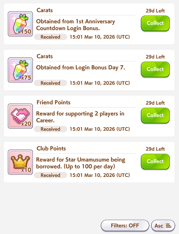 Previous: >>559857281>Global Game NewsLink your account to Cygames iDCurrent Scenario: Aoharu Hai aka "Unity Cup"Current Rate Up Trainee: Admire Vega (3*)Current Rate Up Support Cards: Kawakami Princess (Speed), Fine Motion (Wit)Current CM: Aquarius Cup - Tokyo Dirt 1600m03/02 - 03/12 - Aquarius Cup - Tokyo Dirt 1600m Left/Winter/Sunny/Firm03/02 - 04/14 - Halved TP Cost & 2x Career Mode Rewards03/02 - First Anniversary Part 103/05 - Admire Vega (3*), Kawakami Princess (SSR), Fine Motion (SSR)03/12 - First Anniversary Part 203/12 - Kitasan Black (3*), Matikanetannhauser (2*), Narita Top Road (SSR)03/12 - Flying Run-Up! Story Event03/12 - Trackblazer Release date03/22 - Satono Diamond (3*), Curren Chan (SSR), Marvelous Sunday (SSR)03/23 - First Anniversary Part 403/23 - Agnes Tachyon, Narita Taishin, Narita Brian legends races03/26 - First Anniversary Part 403/26 - Mejiro Bright (3*), Curren Chan (SSR), Zenno Rob Roy (SSR)03/26 - 04/05 - Pisces Cup - Long/Right/Spring/Heavy/3200https://umamusume.com/news/100040/https://pages.snep.pw/uma/anni-skill-changes/>JP Game NewsCurrent Rate Up: Almond Eye (3*), SSR Forever Young, SSR Casino DriveNew Scenario "Beyond Dreams" releasedTimeline: https://uma.moe/timelineCygames Webstore: https://webstore.cygames.com/en/umamusume_en/>Thread Clubshttps://rentry.co/umaglobalclublistYou must be E3 (20k points) to join a circle. Apply with /uma/ or /vg/ in your profile or post ID in the thread.>All Guides & Resourceshttps://rentry.org/uma26Game databasehttps://gametora.com/umamusume (Click the gear to switch between JP / global server info)A basic guide for newfagshttps://rentry.org/umaglobalFind networks if your region is blocked from the game or clienthttps://www.umavpn.top/93Seiyuu & Concertshttps://rentry.org/umstTravel Pop-Up Storehttps://travelpopupstore.umamusume.jp/Umamusume Birthday Calendarhttps://ウマ娘.攻略.tools/events/birthdayUma Texthttps://umareader.idsmile.xyz/