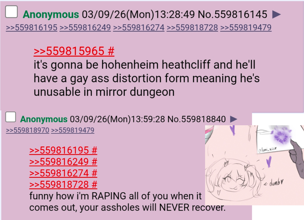 Previous thread: >>559865659Season 7 - Kumo no Ito2025.12.31 — Mirror Dungeon #7 - Mirror of Names and Spiders2026.02.19 —Refraction Railway Line 5 - Merry Go Round2025.02.20 —>Current EventsThe 8th Walpurgis Night - The Dusk of Amber2026.03.05 — 2026.03.193rd Anniversary Event2026. 2. 26 12:00 — 2026. 3. 26 10:00 (KST)>Current Extractions2026.03.05 — 2026.03.19[000] Lobotomy E.G.O::Hornet [Alteration] Meursault[000] Lobotomy E.G.O::Faint Aroma & Solitude Ryoshu[HE] Harmony Sinclair2026.03.05 — 2026.03.19Target Extraction: [ The 3rd & 4th Walpurgis Night BokGak ]>FAQs! This game is directly tied to the setting of Project Moon's previous games, Lobotomy Corporation and Library of Ruina, and is set after both. Expect spoilers for those games in this thread.! The tutorial is important.>Download linksAppStore: https://apps.apple.com/app/limbus-company/id6444112366Google Play: https://play.google.com/store/apps/details?id=com.ProjectMoon.LimbusCompanySteam: https://store.steampowered.com/app/1973530/Limbus_Company/>Other linksOfficial twitter: https://twitter.com/limbuscompany_bOfficial youtube: https://www.youtube.com/@ProjectMoonOfficialOfficial site: https://limbuscompany.global>Required readinghttps://mega.nz/folder/xosDkZ5Z#Wt4JpUt5Bb2XG77pxuuXpw>For all your EGO and Sinner info needshttps://limbus.kusoge.xyz/https://gll-fun.com/en/>Useful resources and a general guidehttps://rentry.org/lcg_resourceshttps://rentry.org/lcbguidehttps://rentry.org/LCB_optimal_grind_guidehttps://lcb-days-since-last-id.carrd.co/https://lcb-days-since-last-ego.carrd.co/>Countdownhttps://lcbcountdown.carrd.co/