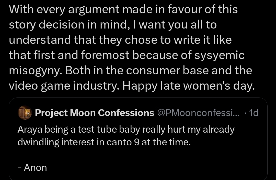 >>559886205>"I'm gonna use some IDs with Facade in the MD to show it off">internet, stream issues>"I'm going to try and get Lunar Memory">lucklets into oblivion>"Fuck it 1000 Lunacy">"Wait my employee said it should be 1300, because he's paying for it you will be getting 1300">>559886426You could cosmetically decorate your librarians however you wanted in Ruina. Only rub in Limbus is that you have to pay a currency.>>559886510I'm 90% sure that's just because they don't have a solution for sinners whose base sprites change with the story.