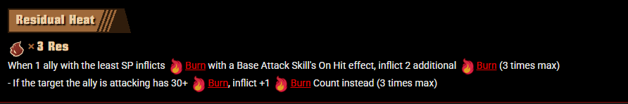 >before use: gain 8 x wrath res. burn potency>on hit: consume up to 10 burn count on target to gain (burn count on target)/2 burn potency, and deal (burn potency on target) wrath damage (max 30) to target and self>after use: take (burn potency on self)% of max hp damage>if (burn potency on self)/25 is equal or higher than burn count on self, this unit dies insteadhere's ur ardor blossom diaper lover faust, bwo
