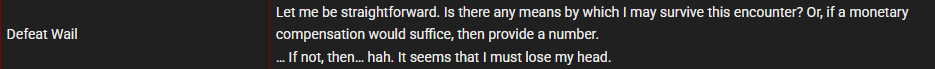 >>559886672If any of the following happens, you get kicked out or the fight becomes unbeatable>bringing keypage of the boss you get as a part of its book rewards (because of spaghetti coding making them incompatible)>bringing librarians with high stats (HP or resistances, starting HP is counted for the former so that Yujin doesn't trigger it)>preventing the boss from using enough actions per turn, including forcing them to use cards that aren't from their deck too many times>staggering the boss way more frequently than realistically possible>being immune to specific status effects>somehow stealing or removing specific statuses>the boss somehow having statuses it normally can't have>bringing more than 5 librarians>being immune to death>depleting the boss' HP way faster than normally possible>forcing the boss to minroll way more than realistically possible>using specific effects that are normally inaccessible to the player>removing passives from the boss or adding new ones>somehow spawning the boss outside of intended reception>reviving too often>the boss rolling way lower than normally possible excluding effects of Feeble and DisarmThere are likely more I'm not remembering.If you somehow reach victory screen without the boss' consent regardless of how you've managed to do it, the game crashes.None of these are active in the normal version of the fight outside of the keypage and status conditions.