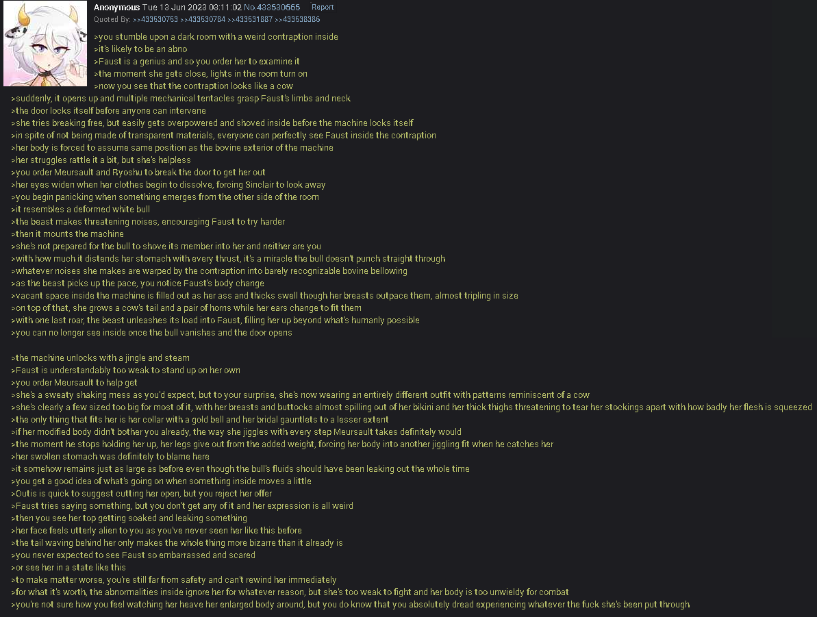>>559906590God, imagine being her coworker and watching her enter a new containment chamberYou have your own work to do and you trust her to do well even with an unfamiliar abnoNext time you see her, she gives you a blank stare until you wave at her, a gesture she returns with a small delayShe doesn't respond when you ask her how her work went, just nodding repeatedly as if that is a valid answerShe's not wearing her EGO anymore and you have no idea whyYou don't know what to say when she starts silently following you as you leave for workWhen you finally get fed up with her weird behavior, her smile grows and she giggles before pushing you downAs you're pinned to the floor, you notice that she feels unusually hot despite not wearing her EGO suit anymoreYou get uncomfortable when you feel her hot breath on your face before she begins undressingWithout any clothes covering them, you notice that her breasts are larger, but the left one has a misaligned nipple and there's a nasty gash on her stomachYou try to get away, but she feels much heavier than she should beShe doesn't even bother undressing her lower half properly, just clawing at her pants and stained underwear until her genitals are exposedYou are not prepared to see discolored fingers tear through her mangled vagina and firmly grasp your bulgeAs your dick gets hard against your will, the misplaced fingers pull it inside and you feel something sharp scraping itYou try to scream for help, but find your mouth covered by her hand, muffling your voiceShe moves her face close enough for your noses to touch with a soft giggle"I love you...""I love you!"Her soft lips quickly press against yours as she worms her tongue inside your mouth, shoving it deep enough for you to gag"I love you""I love you!"You enter the cafeteria and find your coworker working on her meal, preparing for workYou have your own work to do and you trust her to do well even with an unfamiliar abno