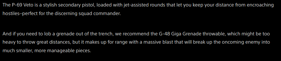 >>559888972if I had to guess: >the SMG is a Defender, but you sacrifice two magazines and a lot of ergo for half of a Crisper>the pistol is Senator but light pen>the grenade is pre-buff dynamite but without the long fuse>the Entrenchment Tool is the existing Entrenchment Tool but moved to the secondary slot (original no longer exists) >the flamethrower is almost identical to the existing one, just with 10% more ammo and extra range (but also less damage for some reason) >the gas mortar makes the EMS mortar completely irrelevant forever