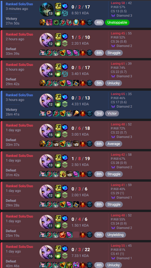 You play all day, and maybe ONE, MAYBE one, is a match where every single player is in the elo they belong and it actually comes down to how people play.The rest of the matches are>Retard #1641647 makes enemy top go 10-0>Retard #1616464347 makes enemy jg go 10-0>Retard #3103616464 makes enemy bot go 10-0