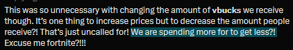 The raising of v-bucks prices doesn't upset me as much as the removal of half the v-bucks from the BP. That's just a dick move.