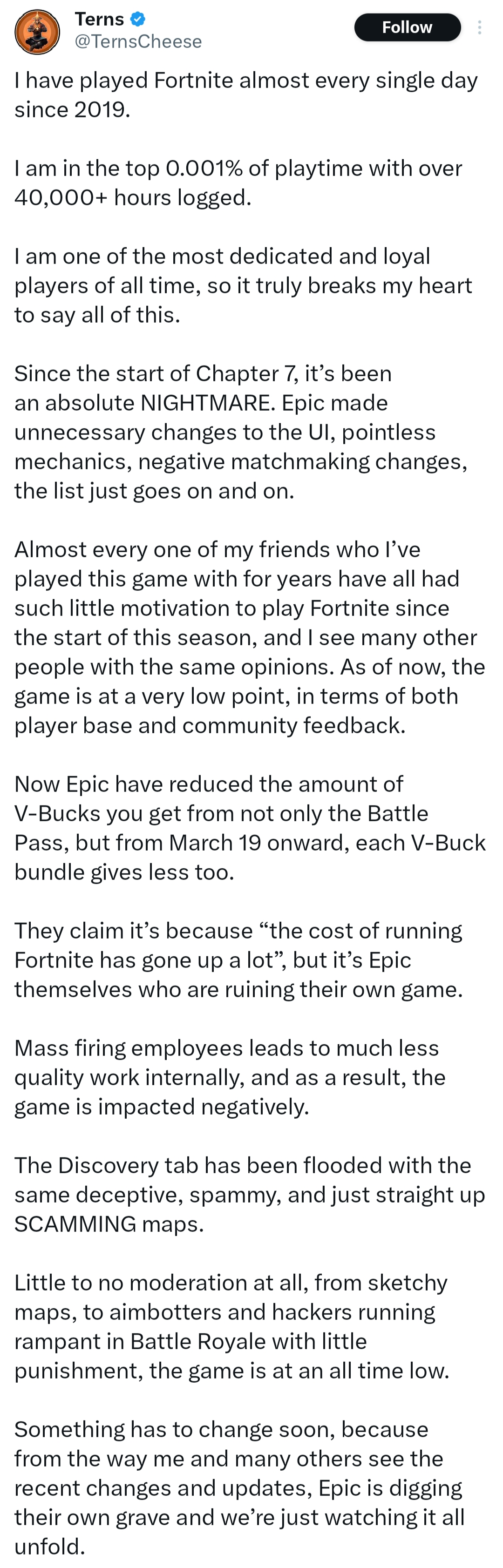 >Didn't care about the metaverse slop or any of the metaverse skins like cars or instruments>Rarely if ever bought something from the shop, just stuck with BP skins>Sitting on a pile of vbucks built over last few chapters of extra pass buxThe only thing I'm annoyed about personally is no longer getting extra vbucks, but they had the benevolence to still let them pay themselves off I guess (for now)