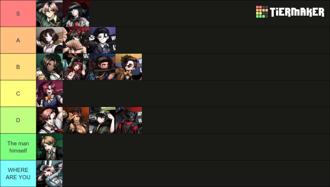 There should be more dual pics like this. >>559954784Honestly I didn't think of Souda as anything more than a mildly (yet easily ignorable) annoyance for the entire game, but his FTE was decent actually. Of all the background boring characters he at least had some sort of personality, even if it was an embarrassing groveling one for women. This >>559896339 was my tier list of all the DR2 Dangans I posted last thread.>>559955196Not far off from the truth, Imposter, but please "I like his design"? Its rather ugly... I had no taste for the punk aesthetic, at least not how its presented like that anyways...
