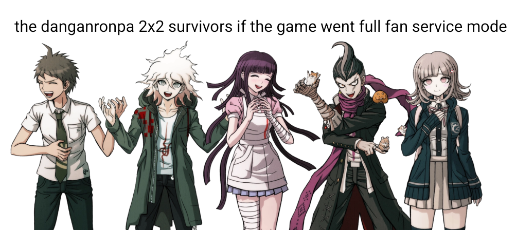 >>559942773Not the worst cast of survivors and blackened Ibuki is pretty based. But Mahiru protagonist is a meme, she's not even a top 5 most popular character in 2. At best, it's gonna be Nagito or Chiaki. Let it go you fucking plain bread enjoyers.