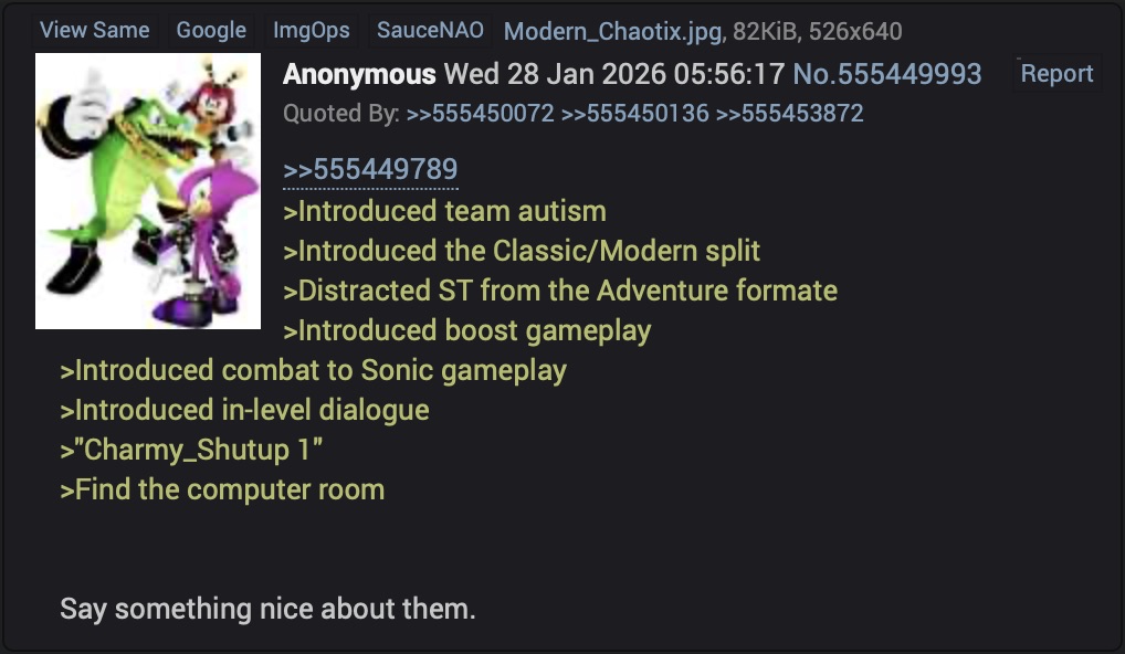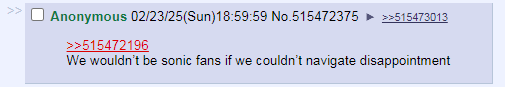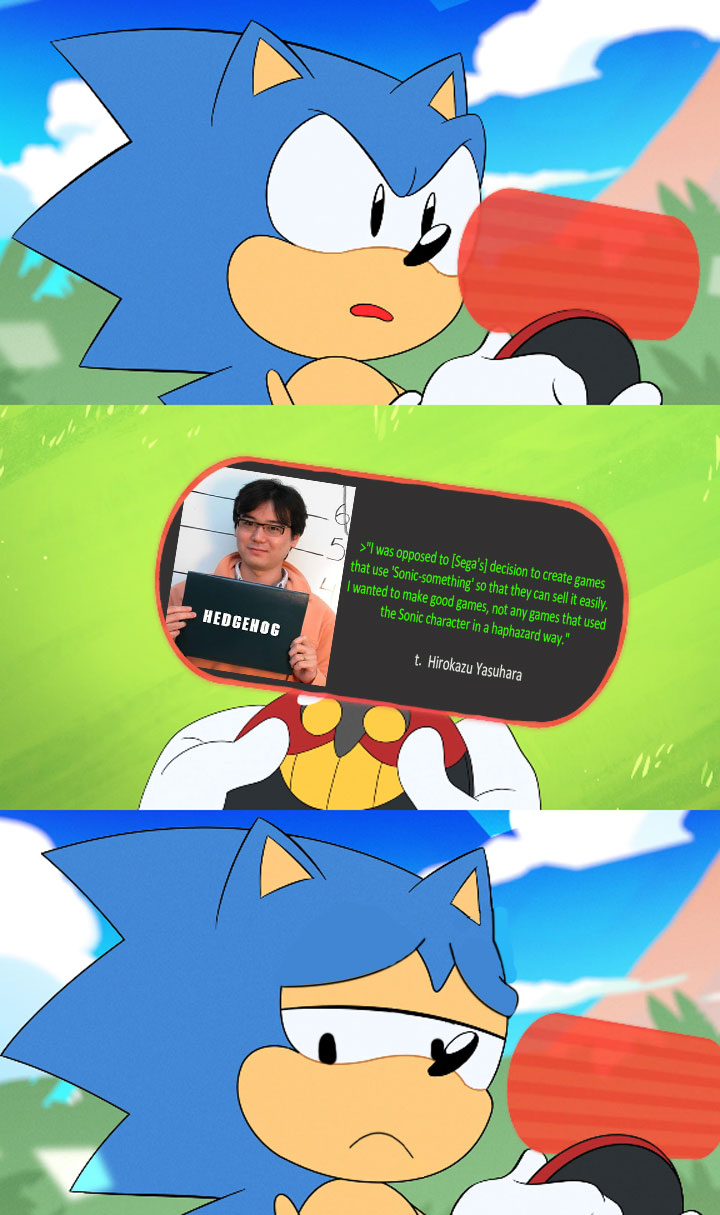 >>559947882>consistent across every sonic media, games included>somehow that's not enough to get the messageyou probably will never. unless you turn sonic into a drama
