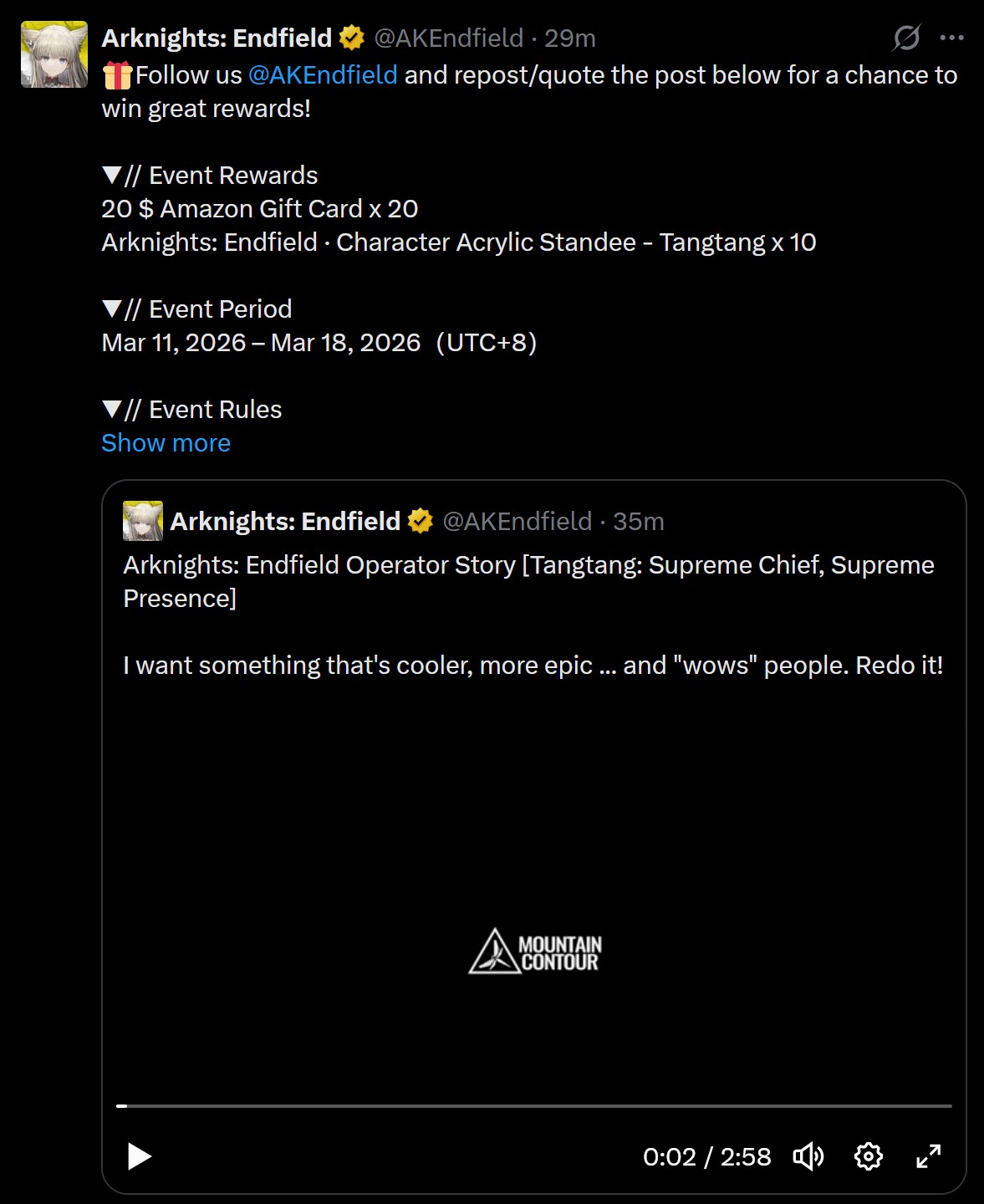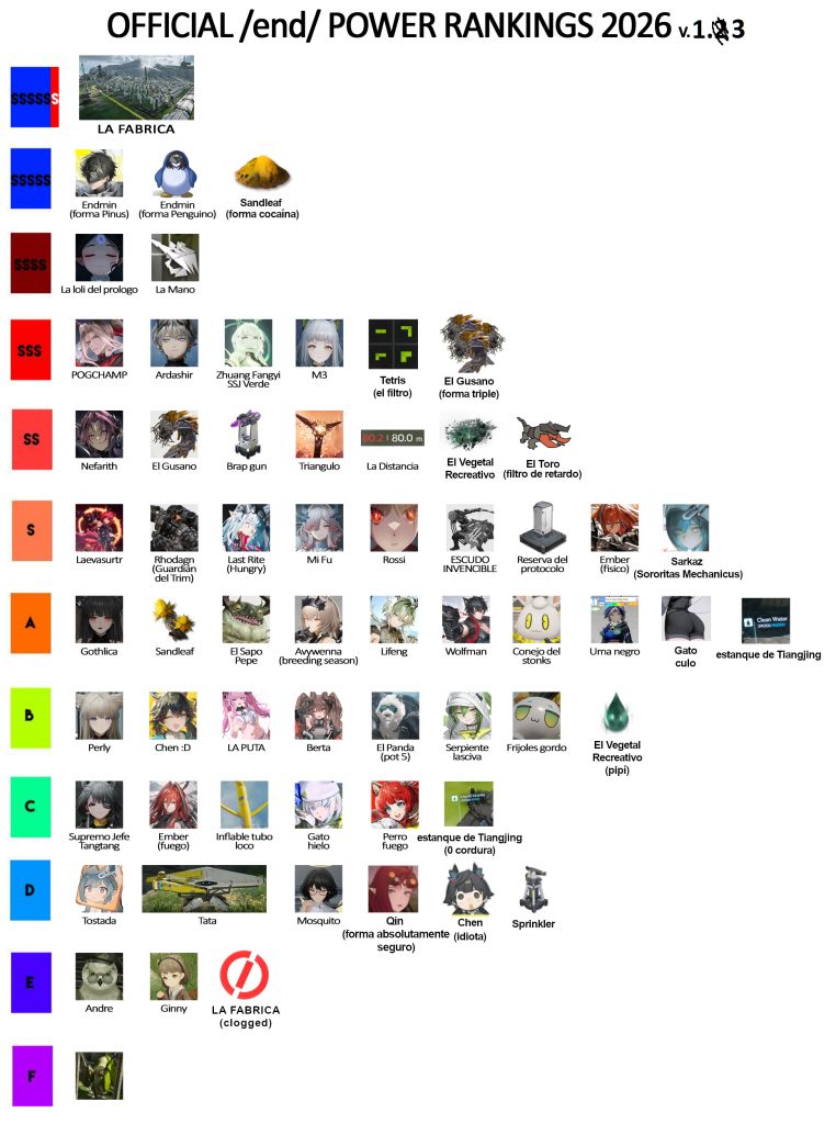 Previous thread: >>559905259>Old Deep Water Dies, by Rising Tide It is Deniedhttps://youtu.be/AtoOV6q7LnU - Version Trailerhttps://youtu.be/eKTskrTBZxU - Dev Log Stream>Official Websitehttps://endfield.gryphline.com/en-us>Official EN X - Newshttps://x.com/AKEndfield>DEV Comm - Developer Updateshttps://endfield.gryphline.com/en-us/news/3846>Tangtang PVshttps://youtu.be/oZIWH05jyjQhttps://youtu.be/lOZsnNh3kg8>Chartered Headhunting ScheduleFebruary 24th to March 12th Hues of Passion, YvonneMarch 12th to March 29th River's Daughter, TangtangMarch 29th to April 14th Wolf Pearl, Rossi>Reward CodesENDFIELDGIFTENDFIELD4PC>Twitch Dropshttps://endfield.gryphline.com/special/third-party-binding?channel=twitch>Wikishttps://wiki.skport.com/endfield (Official)https://perlica.moehttps://warfarin.wiki/enhttps://endfield.wiki.gg/>Blueprint Guideshttps://talospioneers.com/en>Stickershttps://drive.google.com/drive/folders/13KH3L6QPIKkVH7pBddv4uxwmwJsnOtklhttps://drive.google.com/drive/folders/1OuVtjv1k-9c3M6n7d4PX3CGG5bkwH04ahttps://drive.google.com/drive/folders/1AStB8bzFk3lSwMwczWPkFYCBrZe0vHOghttps://drive.google.com/drive/folders/1yS0lqUhxf8tBRtpDFfCU1y16IS2sSeF7>Fri/end/sSubmit your info, /end/min:https://forms.gle/Fo7BhZMKaKqiWyL19View other /end/mins:https://docs.google.com/spreadsheets/d/1YtxiDss0hgEQhLlZgpfzyGrJrzUcqDzOS9T6IH-BiVc/edit?usp=sharing