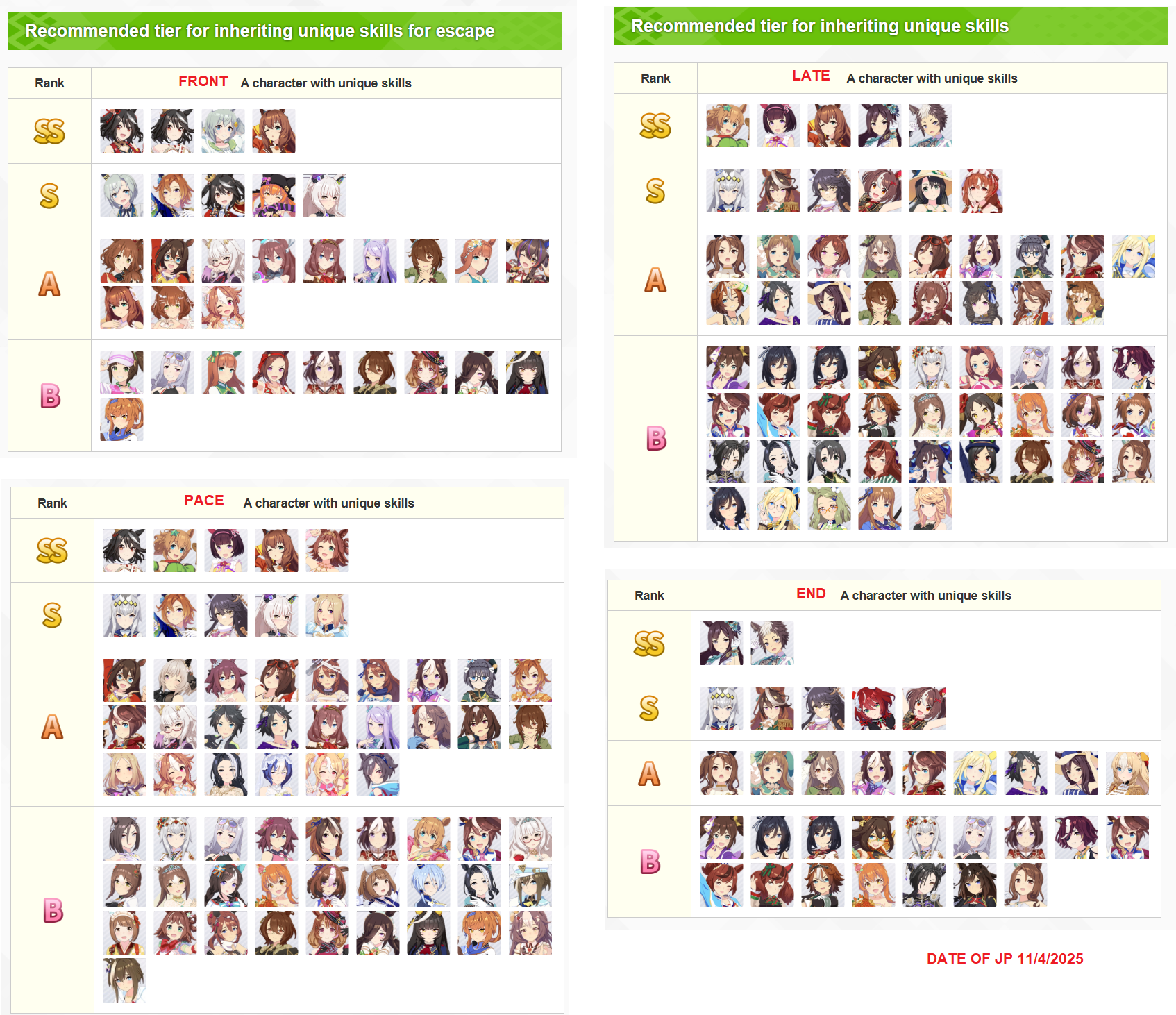 >>559970087I made that one, i basically ripped it from a JP tier list on the date in the corner.Its an overall list thats not track specific and Japanese are less competitive compared to global. Umas listed are accel parents so it is a decent baseline for parents.