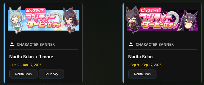 Previous: >>559949870>Global Game NewsLink your account to Cygames iDCurrent Scenario: Aoharu Hai aka "Unity Cup"Current Rate Up Trainee: Admire Vega (3*)Current Rate Up Support Cards: Kawakami Princess (Speed), Fine Motion (Wit)Current CM: Aquarius Cup - Tokyo Dirt 1600m03/02 - 03/12 - Aquarius Cup - Tokyo Dirt 1600m Left/Winter/Sunny/Firm03/02 - 04/14 - Halved TP Cost & 2x Career Mode Rewards03/02 - First Anniversary Part 103/05 - Admire Vega (3*), Kawakami Princess (SSR), Fine Motion (SSR)03/12 - First Anniversary Part 203/12 - Kitasan Black (3*), Matikanetannhauser (2*), Narita Top Road (SSR)03/12 - Flying Run-Up! Story Event03/12 - Trackblazer Release date03/22 - Satono Diamond (3*), Curren Chan (SSR), Marvelous Sunday (SSR)03/23 - First Anniversary Part 403/23 - Agnes Tachyon, Narita Taishin, Narita Brian legends races03/26 - First Anniversary Part 403/26 - Mejiro Bright (3*), Curren Chan (SSR), Zenno Rob Roy (SSR)03/26 - 04/05 - Pisces Cup - Long/Right/Spring/Heavy/3200https://umamusume.com/news/100040/https://pages.snep.pw/uma/anni-skill-changes/>JP Game NewsCurrent Rate Up: Almond Eye (3*), Loves Only You (3* alt), SSR Forever Young, SSR Casino Drive, SSR Marche LorraineNew Scenario "Beyond Dreams" releasedTimeline: https://uma.moe/timelineCygames Webstore: https://webstore.cygames.com/en/umamusume_en/>Thread Clubshttps://rentry.co/umaglobalclublistYou must be E3 (20k points) to join a circle. Apply with /uma/ or /vg/ in your profile or post ID in the thread.>All Guides & Resourceshttps://rentry.org/uma26Game databasehttps://gametora.com/umamusume (Click the gear to switch between JP / global server info)A basic guide for newfagshttps://rentry.org/umaglobalFind networks if your region is blocked from the game or clienthttps://www.umavpn.top/93Seiyuu & Concertshttps://rentry.org/umstUmamusume Birthday Calendarhttps://ウマ娘.攻略.tools/events/birthdayUma Texthttps://umareader.idsmile.xyz/