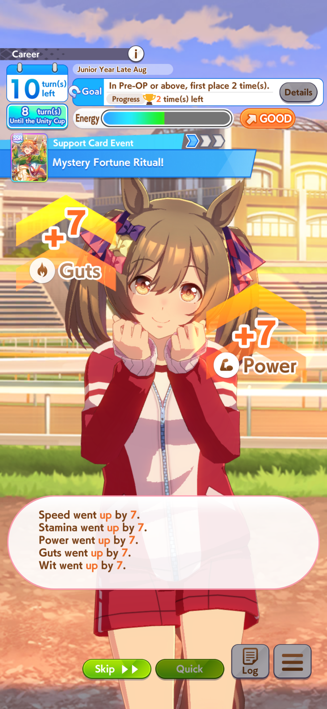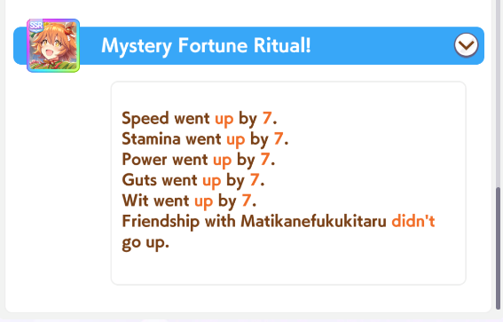 >>559982858>try to make last minute dirt maru>get mile, dirt, and front to S>get no skills from inspiration >4 support cards failed to resolve, 2 didn't even startAt least there was onsen sex, so it wasn't a complete wash