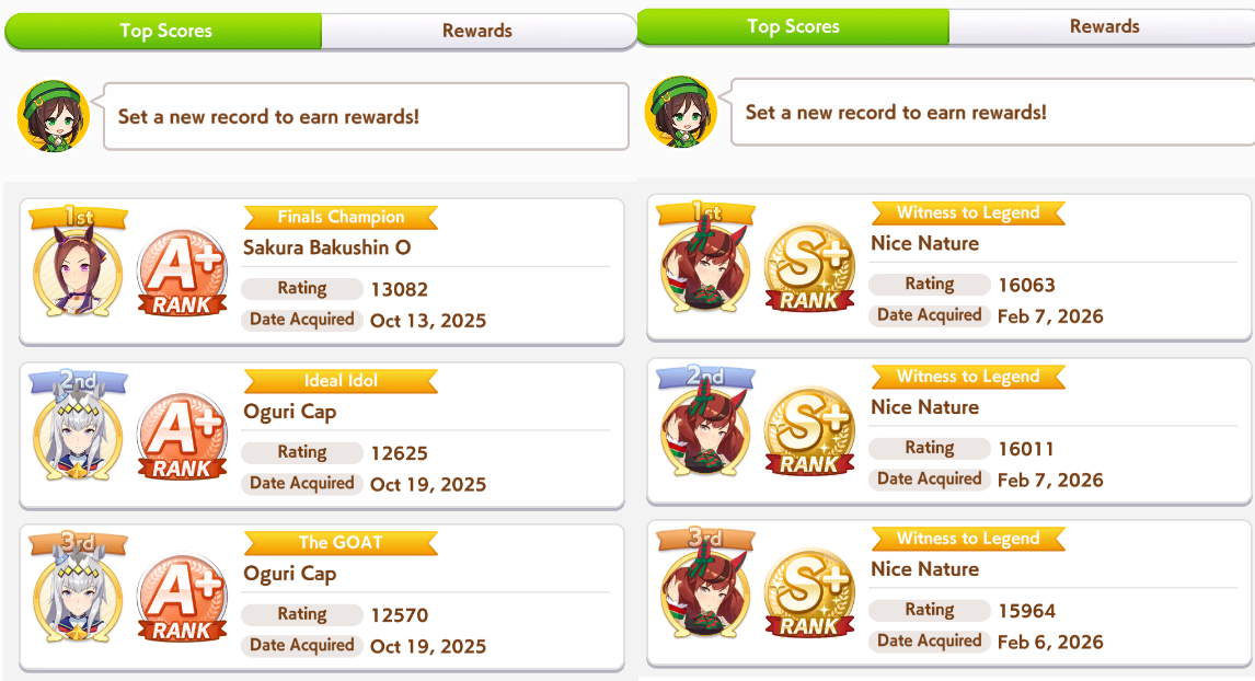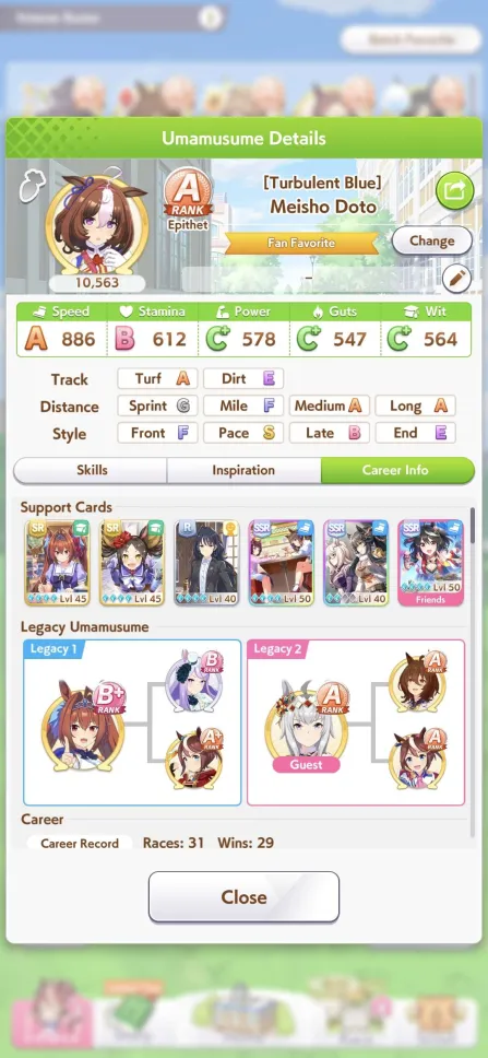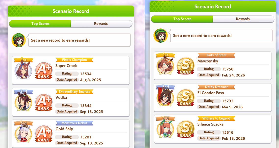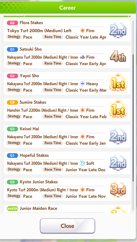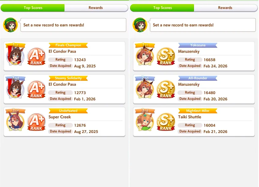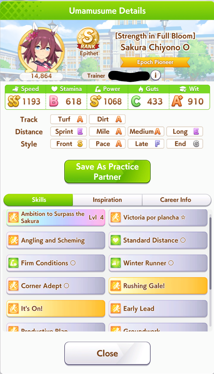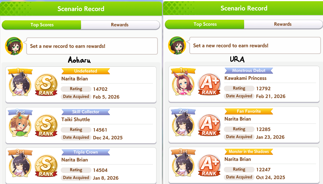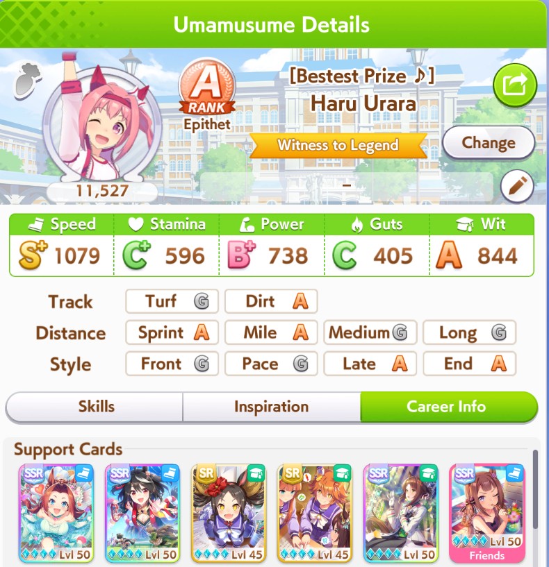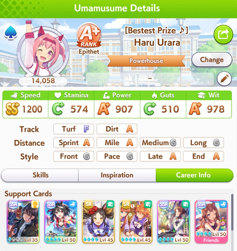 >>559967102the days of smurfing in open are long gone, the shitters and dead weight umas are gone, so just hitting the stat target is no longer enough to get that WR>>559967228open forces you to learn what your deck gives you and what you can train to achieve the stat target you came to after test using the calculator and simulator, but a proper open ace will always have both distance and ground type as S, at least 3 greens skills and a couple white/gold skills, and there's always 2 buildings: the minmax and the stamina gambler (I fucking hate stamina gamblers)