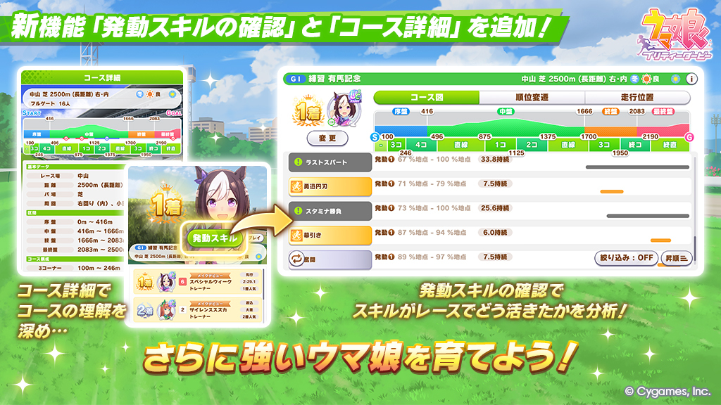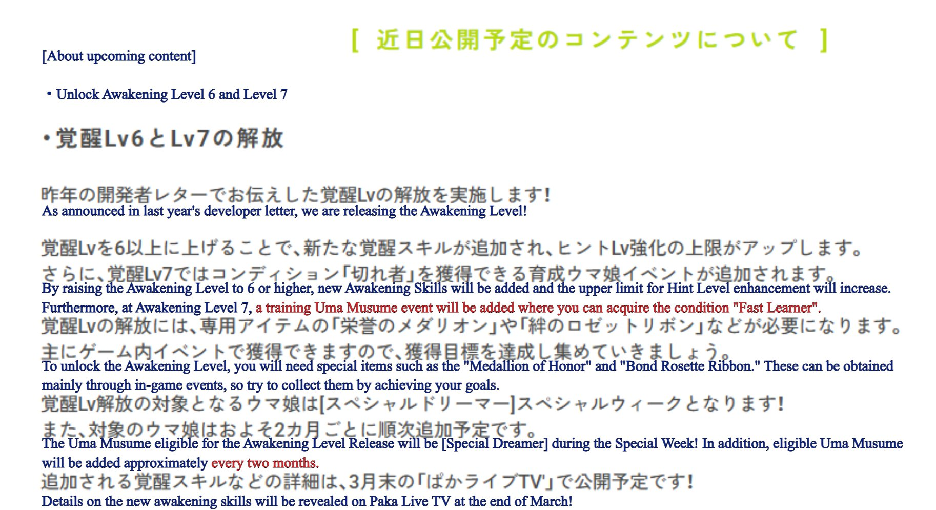 New changes in JP for those that are interested>New L ranks for stat parameters>Oonige (great escape) buffed: “solo breakaway" (単騎逃げ) strategy has been buffed, to account for the fact that previously, breakaway strategies, particularly in CMs, required a team of 2 or 3 breakaway umas to be effective. >This has been achieved through adjustments to the Position Keep mechanic as well as the addition of Zenkai Spurt (all-out spurt, "全開スパート")>New awakening levels 6 and level 7>At level 6, new skill hints added>At level 7, unlocks a new training event that grants the "Sharp" (Fast Learner in EN) condition>Two new consumables, "medallions of honor" (栄誉のメダリオン) and "bond rossette ribbons" (絆のロゼットリボン), acquirable through training runs, will be needed to raise to the new levels>A few umas will receive the new awakening levels every other month.>The first uma who will receive the new levels will be Special Week (OG ver.)>More details will be released at the next Pakalive this month>Also, a multi-chapter short spinoff manga will release for Cingrey next week.Oonige buffs and also guaranteed fast learner…