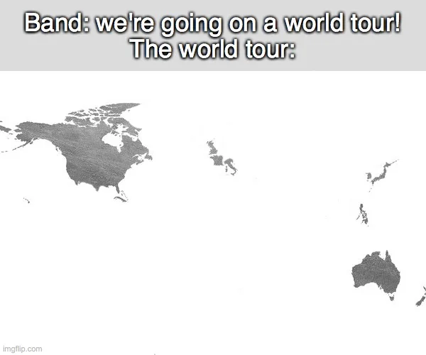 >>559982086>Australia>fucking New ZealandlmaoI wishthe "world" tour will be one, maybe two, sides of the US, and all of SEA