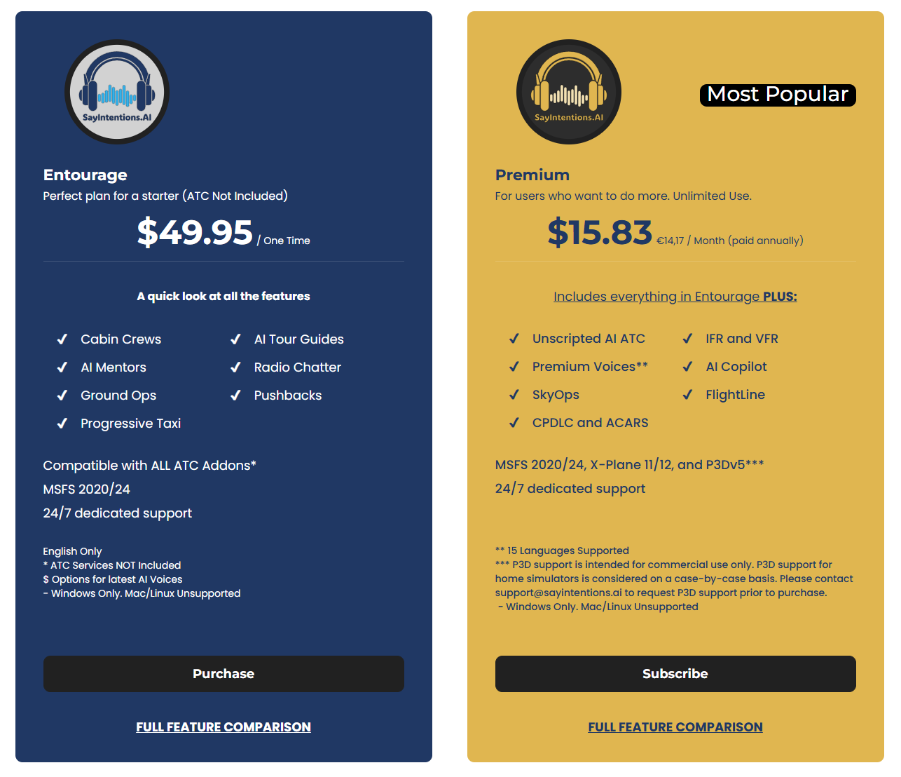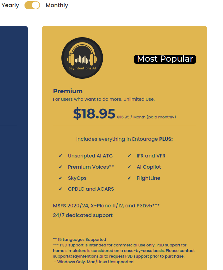 >>560031012For X-Plane I think your options are Pilot2ATC and SayIntentionsSayIntentions is better in basically every way but is like a $200 a year subscription.Pilot2ATC is a one-time $60 purchaseReally I never touch Pilot2ATC anymore -- it uses the less-reliable old-school built-in Windows voice recognition, and has no traffic injection so is never controlling anyone but you -- but it does have one nice thing: you can file an IFR flight plan to and from any airport (which I assume the built-in x-plane ATC an do too), whereas SayIntentions IFR requires the airports be in SimBrief. This likely won't matter if you're flying airliners but for tiny planes that can land on tiny airstrips, it's annoying those usually aren't in SimBrief.BeyondATC and FShud don't currently support X-plane as far as I can see