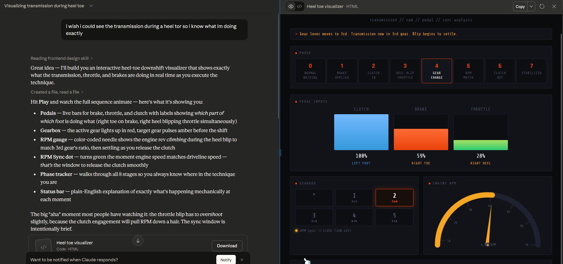 >learning how to heel toe>ask claude if someone made a telemetry visualizer for it so i know if im doing it right>it just straight up codes one for mewtf im a developer now