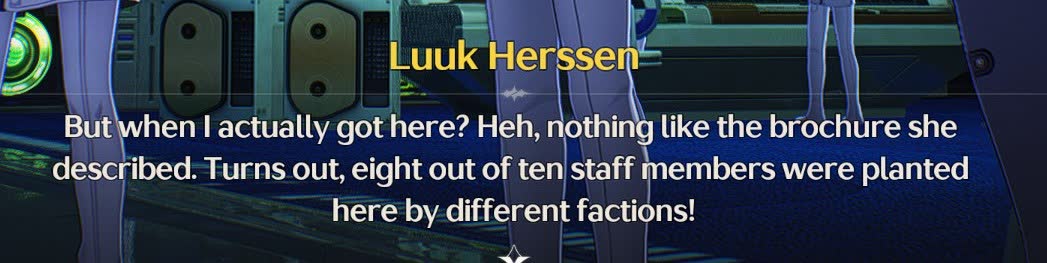 Man I fucking love this story quest. I actually want to reward Kuro for this because it had everything I was asking for a Rover centric quest. Mostly focused on Rover and Fully Voiced. I'm so tired of us still having dialogue options when it's more impactful to have Rover deliver the lines with the right emotion.I would totally pull for Luuk if I didn't blow everything in the last few patches already. Pretty good character. Still hate his get up but I get the context. I just hate that Kuro would read this as a massive failure and they would proceed to fucking never make something like this again. I fucking hate gacha.