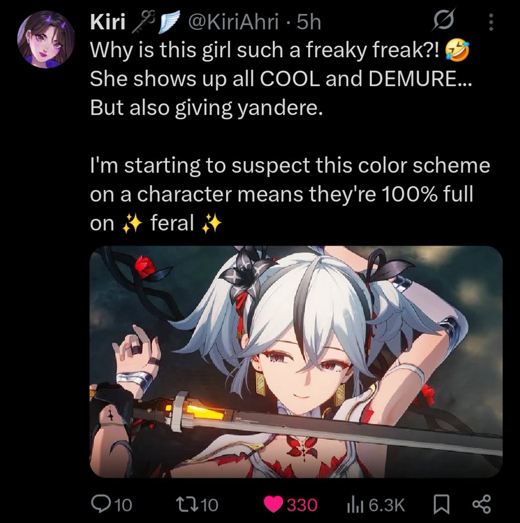 >>560071324Thats fair, but I do think she will be a obvious glacio chafe support, because at that point Chisa will be required in too many teams, Rover already covers for Carthy or Zani, so Chisa for Aemeath and Suisui for Hiyuki just sounds about right.>>560071439Since when is cyberpunk made by Kuro?>>560071494Vergil already got replaced and Dante is on countdown already because Kamui is extremely likely to be fire.