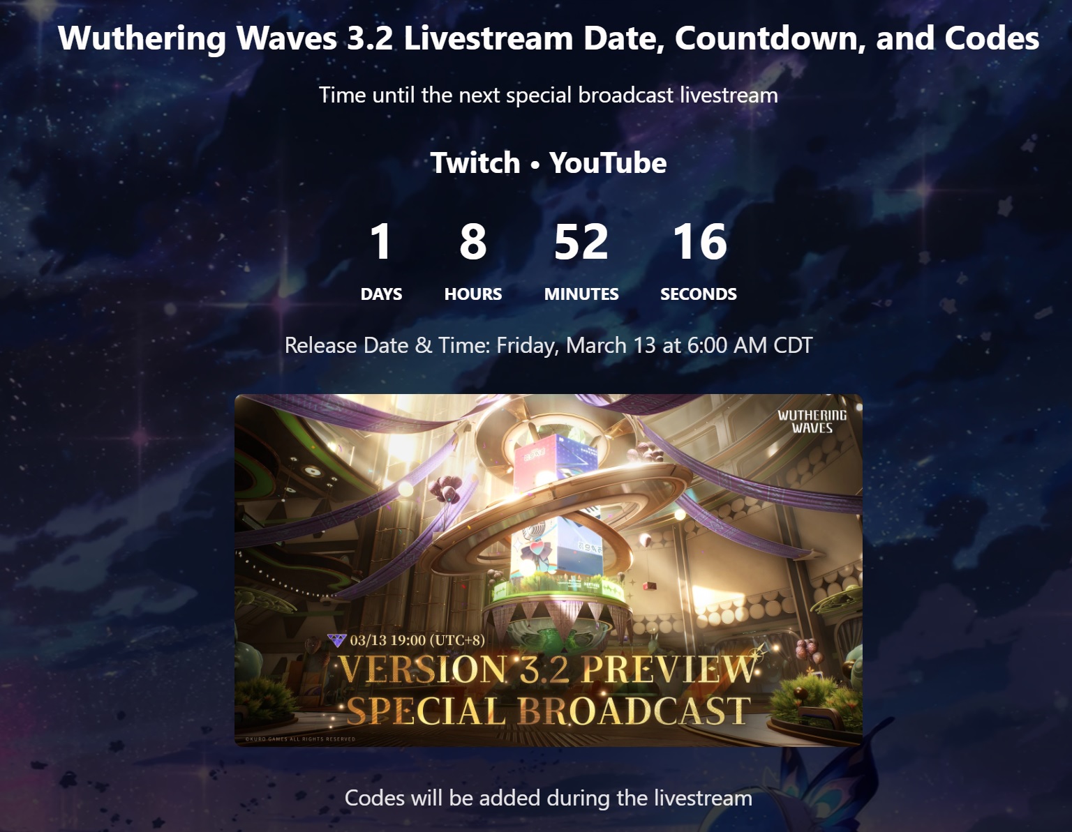 Download (Android/iOS/EGS/Windows)https://wutheringwaves.kurogames.com/en/#mainhttps://store.steampowered.com/app/3513350/Wuthering_Waves/>Wuthering Waves Story Cinematics | Me and Youhttps://youtu.be/XIvgewM4Mj4>Wuthering Waves Story Cinematics | Originhttps://youtu.be/DXRqVumTFh4>Wuthering Waves | Resonator Showcase | Luuk Herssen — PUTRID TRUTHhttps://youtu.be/gF7Ff_YbU0E>Wuthering Waves Resonator Combat Showcase | Luuk Herssenhttps://youtu.be/qx4fh8tWje0>Wuthering Waves Version 3.1 Official Trailer | For You Who Walk in Snowhttps://youtu.be/6lpiSBvawB0>Map:https://wuthering-waves-map.appsample.com/>Convene Trackerhttps://wuwatracker.com>EventsWHEN IN DOUBT, CHECK: https://wuwatracker.com/timeline[Peaks of Prestige: Rekindled Duel Echo Combat Event][05 Feb -17 Mar][Startorch For You] [05 Feb -17 Mar][TERM-X: Outreach Exploration Event][05 Feb -17 Mar][Full Throttle! Bolt & Blitz! Leisure Event][06 Feb -17 Mar][Where Stars Cascade Down: Limited Time Event] [14 Feb -18 Mar][Blade Hunter: Wilderness Featured Combat Event] [26 Feb - 15 Mar]>Timeline, Rewards and Media Contentshttps://rentry.org/wuwavgv2>Emoteshttps://drive.google.com/drive/folders/1GY6YgPhhOsxN2oW0AbIywdO9Z1_OFe6Khttps://files.catbox.moe/49buge.ziphttps://drive.google.com/drive/folders/1FE1Nh3zDNVP6gZxMrgqaZ2VszzYr-1Pp>/wuwa/ Friends Listhttps://docs.google.com/spreadsheets/d/1MzulbsusjOWpaFg6o6kk3TvCWfFYi6EF7NyJXqIazGo>NEWS/EVENTS (and patch notes)https://wutheringwaves.kurogames.com/en/main/news/detail/3941https://wutheringwaves.kurogames.com/en/main/news/detail/3920Previous: >>559885894
