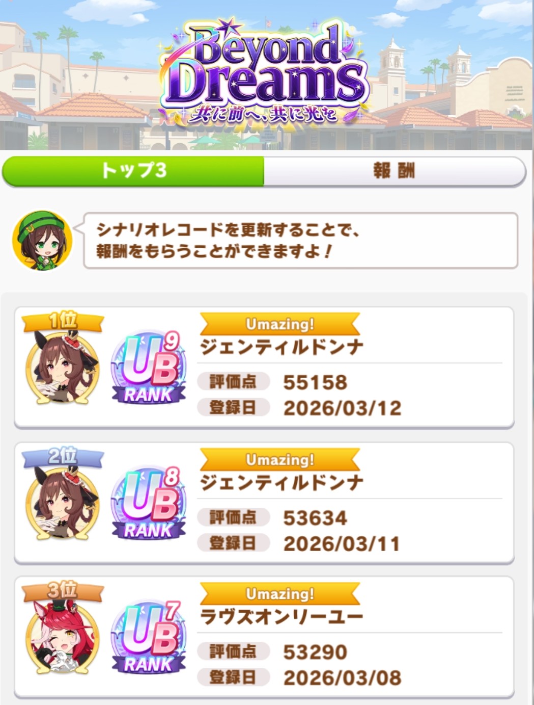 Previous: >>559664730>Game NewsCurrent Rate Up:Loves Only You BC Alt (3*), Marche Lorraine (SSR), Super Creek (SR)Legends' Race w/ Inari One (Festival) & Biwa Hayahide (Christmas) currently underway>5th Anniversary Campaign currently underway - Part 3 is outPart 3 Full Details: https://umamusume.jp/news/detail?id=3107Developer Letter: https://umamusume.jp/news/detail?id=3128CM Classic will be held on 3/22, Del Mar, 2200m, left, good, spring, sunnyCM Dirt will be held in April, Del Mar, 2000m, left, good, spring, sunnyLoH Mile will be held in May, Kyoto, 1200m, right, spring>Beyond Dreams Guidehttps://docs.google.com/document/d/1ibD_nSFr923JtCxRS7GJikwY9csnMBkfRzsLnew5jvg/edit?usp=sharing>IP NewsDetails on Pakalive Dash this monthDetails on 7th Event World Tour this monthTravel Pop-Up Store:https://travelpopupstore.umamusume.jp/Coco's Collab:https://umamusume2026.cocos.jp/>Thread Circlesウマオオオオ (20 million/month), PUMA, ウマぴょいのまにまに (No quota)You must be E3 (20k points) to join a circle. Apply with /uma/ or /vg/ in your profile or post ID in the thread.>All Guides & Resourceshttps://rentry.org/uma26Find networks if your region is blocked from the game or clienthttps://www.umavpn.top/Seiyuu & Concertshttps://rentry.org/umst>/uma/ monies derbydacchi.gudnight.fyi>/uma/ POG (Paper Owners Game)Register here: >>524354428Season 3: https://pog.netkeiba.com/?pid=tool_group&group_id=102454Season 4: https://pog.netkeiba.com/?pid=tool_group&group_id=108301>Cygames WebStore allows you to buy jims on any devicehttps://webstore.cygames.com/umamusume/>How to link your Cygames IDhttps://support.cygames.com/faq/applink_umamusume