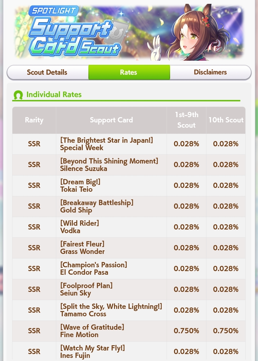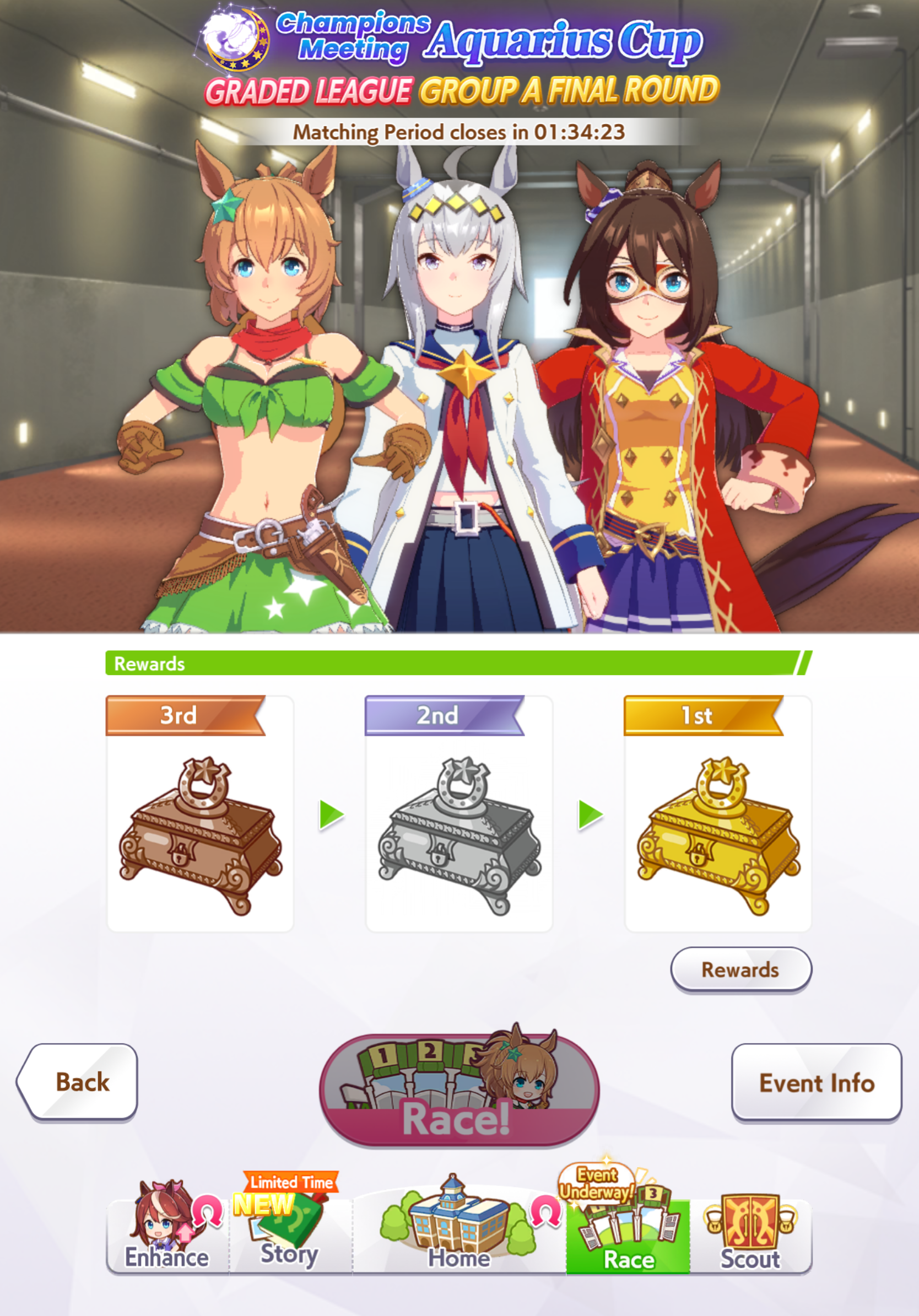 Previous: >>560002956>Global Game NewsLink your account to Cygames iDCurrent Scenario: Aoharu Hai aka "Unity Cup"Current Rate Up Trainee: Admire Vega (3*)Current Rate Up Support Cards: Kawakami Princess (Speed), Fine Motion (Wit)Current CM: Aquarius Cup - Tokyo Dirt 1600m03/02 - 03/12 - Aquarius Cup - Tokyo Dirt 1600m Left/Winter/Sunny/Firm03/02 - 04/14 - Halved TP Cost & 2x Career Mode Rewards03/02 - First Anniversary Part 103/05 - Admire Vega (3*), Kawakami Princess (SSR), Fine Motion (SSR)03/12 - First Anniversary Part 203/12 - Kitasan Black (3*), Matikanetannhauser (2*), Narita Top Road (SSR)03/12 - Flying Run-Up! Story Event03/12 - Trackblazer Release date03/22 - Satono Diamond (3*), Curren Chan (SSR), Marvelous Sunday (SSR)03/23 - First Anniversary Part 403/23 - Agnes Tachyon, Narita Taishin, Narita Brian legends races03/26 - First Anniversary Part 403/26 - Mejiro Bright (3*), Curren Chan (SSR), Zenno Rob Roy (SSR)03/26 - 04/05 - Pisces Cup - Long/Right/Spring/Heavy/3200https://umamusume.com/news/100040/https://pages.snep.pw/uma/anni-skill-changes/>JP Game NewsCurrent Rate Up: Almond Eye (3*), Loves Only You (3* alt), SSR Forever Young, SSR Casino Drive, SSR Marche LorraineNew Scenario "Beyond Dreams" releasedTimeline: https://uma.moe/timelineCygames Webstore: https://webstore.cygames.com/en/umamusume_en/>Thread Clubshttps://rentry.co/umaglobalclublistYou must be E3 (20k points) to join a circle. Apply with /uma/ or /vg/ in your profile or post ID in the thread.>All Guides & Resourceshttps://rentry.org/uma26Game databasehttps://gametora.com/umamusume (Click the gear to switch between JP / global server info)A basic guide for newfagshttps://rentry.org/umaglobalFind networks if your region is blocked from the game or clienthttps://www.umavpn.top/93Seiyuu & Concertshttps://rentry.org/umstUmamusume Birthday Calendarhttps://ウマ娘.攻略.tools/events/birthdayUma Texthttps://umareader.idsmile.xyz/
