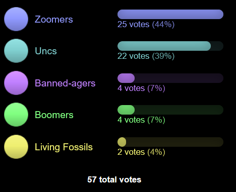 >>560040612I can't believe I share the same generation with teenagers nowThey need to split the generation into uncs (1997-2005) and true zoomers (2006-2012)