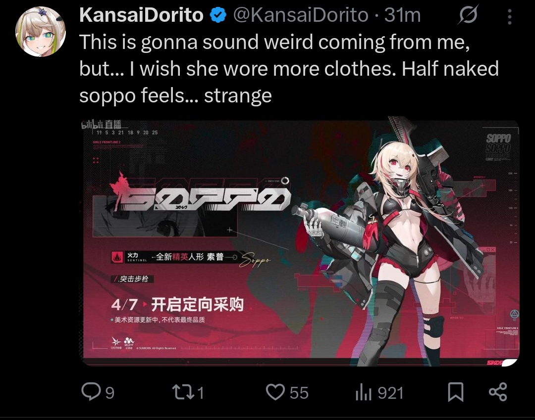 I don't get what all the ass pain over SOP's design in 2 is about. Her damaged outfit in GF1 shows more skin than her new design, and even then her new design is just a bikini top with her navel showing which is tame by most other dolls in 2 so far.