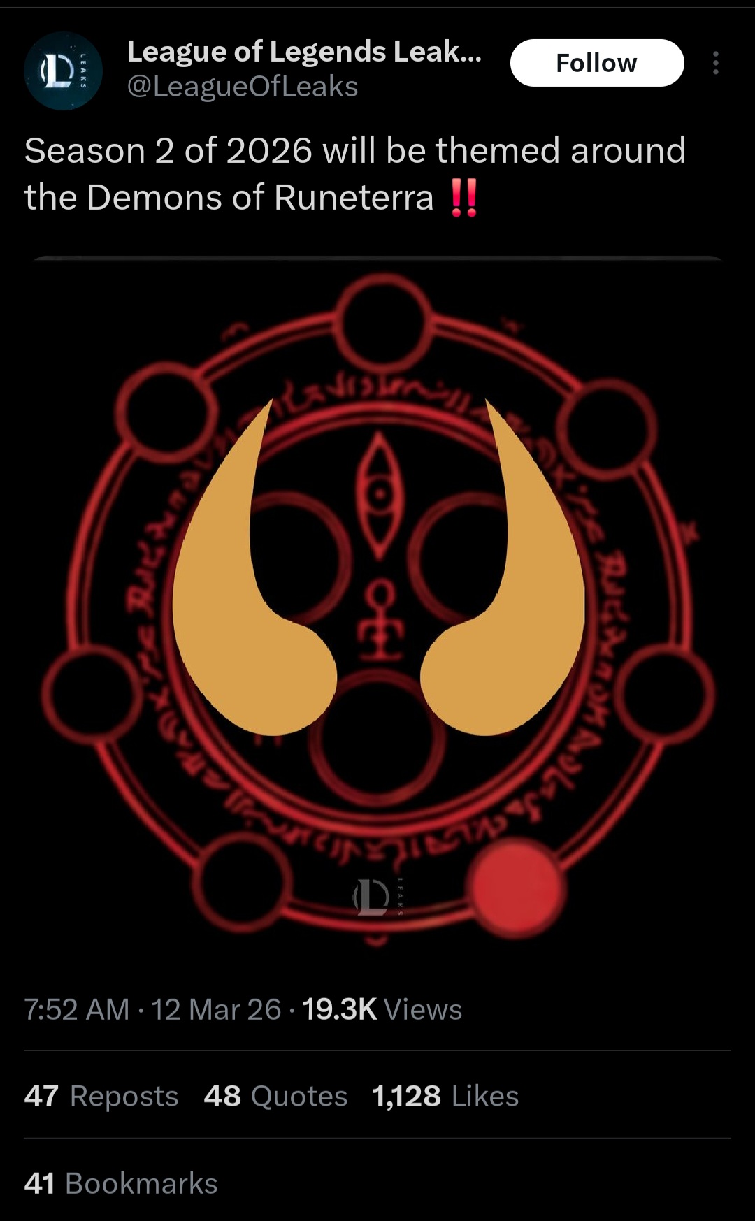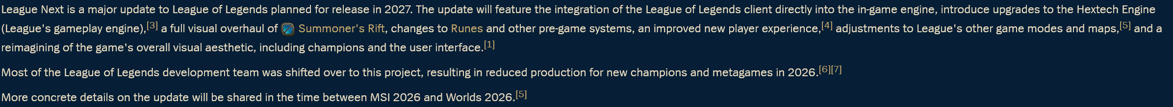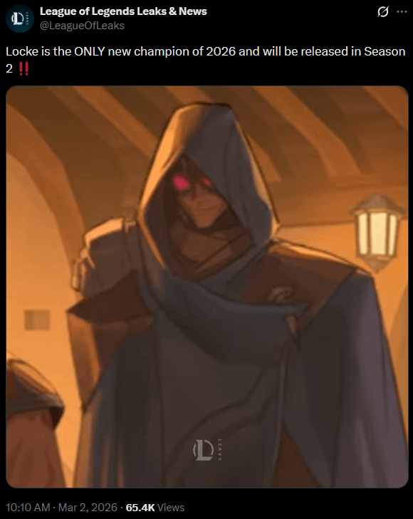 Previous: >>559983410>Current & Upcoming ContentPatch 26.05 (Mar 4, 2026) liveSeason 2026 - Season 1: “For Demacia”Act 2 Battle Pass now available (missions, tokens, cosmetics)New skins: Corrupted Petricite Maokai, Corrupted Petricite Xerath, Prestige Requiem SonaPatch 26.06 - Mar 18, 2026Patch 26.07 - Apr 1, 2026Patch 26.08 - Apr 15, 2026Next new champion delayed until Season 2 (expected May 2026)Riot focusing on MSI patch and balance updates first>EsportsFirst Stand 2026 - Mar 16 - 22 (São Paulo, Brazil)Group A: Bilibili Gaming (LPL), BNK FearX (LCK), G2 Esports (LEC), Secret Whales (LCP)Group B: Gen.G (LCK), JD Gaming (LPL), LYON (LCS), LOUD (CBLOL)Daily start times: EU 14:00 & 19:00 CET | NA 9:00 & 14:00 ETMar 16 - Group A Day 1 14:00 CET / 9:00 ET - Bilibili Gaming vs BNK FearX 19:00 CET / 14:00 ET - G2 Esports vs Secret WhalesMar 17 - Group B Day 1 14:00 CET / 9:00 ET - Gen.G vs JD Gaming 19:00 CET / 14:00 ET - LYON vs LOUDMar 18 - 20 - Group Stage continues (TBD)Mar 21 - Semifinals (TBD)Mar 22 - Grand Final (TBD)>Official Wiki, Patch Notes and PBEhttps://wiki.leagueoflegends.com/en-us/>Builds/Account Statshttps://u.gg/https://www.op.gg/https://lolalytics.com/>Model Viewerhttps://www.modelviewer.lol>/lolg/ Leaderboardhttps://dpm.lol/leaderboards/2f32736c-e08f-4f2b-aae6-3f3326cabd9b>/lolg/ March Drawpilehttps://magma.com/d/ic7qIEWtEJ>/lolg/ OP pastebinhttps://pastebin.com/EXfS6uXB