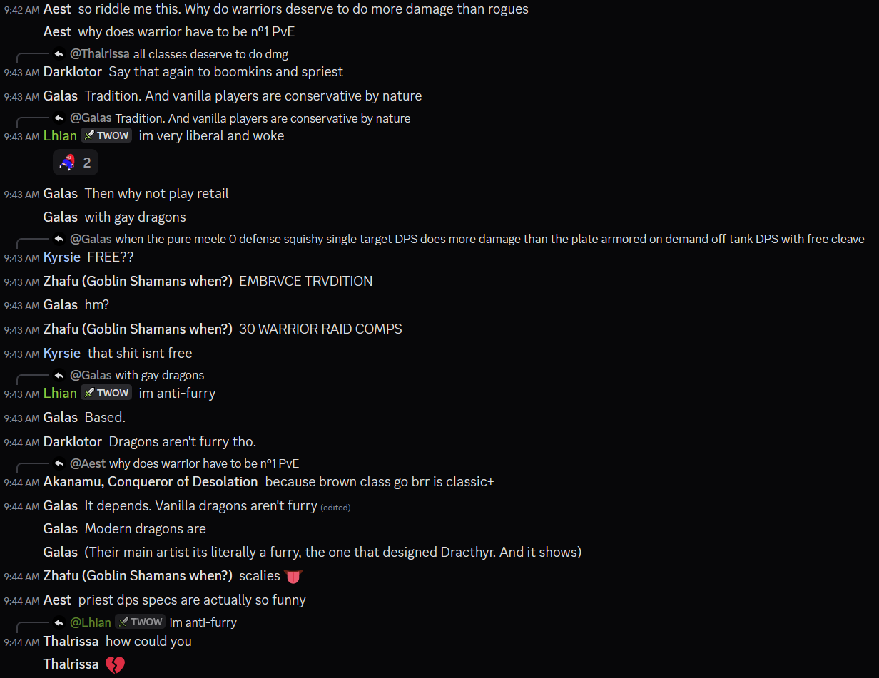 >>560235827Why do you have to be so mean to me? I'm no threat to you any longer. I just wanted to be useful to you.Regarding your question I think its generally bad to take away the main use of a class. Doesn't feel very nice just being a brown rogue or a priest that only hangs around for the fortitude buff or fear ward.Why even bother learning to wear plate on turtle wow as a warrior or wielding shields? When the paladin is just a warrior but fundamentally better in everything and its much easier to play?Why bother leveling a priest when the paladin has insane survivability? Some of the dps classes are neglected too or broken. Like the hunter being a melee class on turtle wow. Its a green rogue with a pet. The class that is meant to excel in ranged fighting is now a melee class.Its like cutting off a birds wings and telling it its fine being a hamster.Meanwhile paladins just get a jet engine strapped on their backs and don't even need any skill to fly. What else am I to feel but contempt?