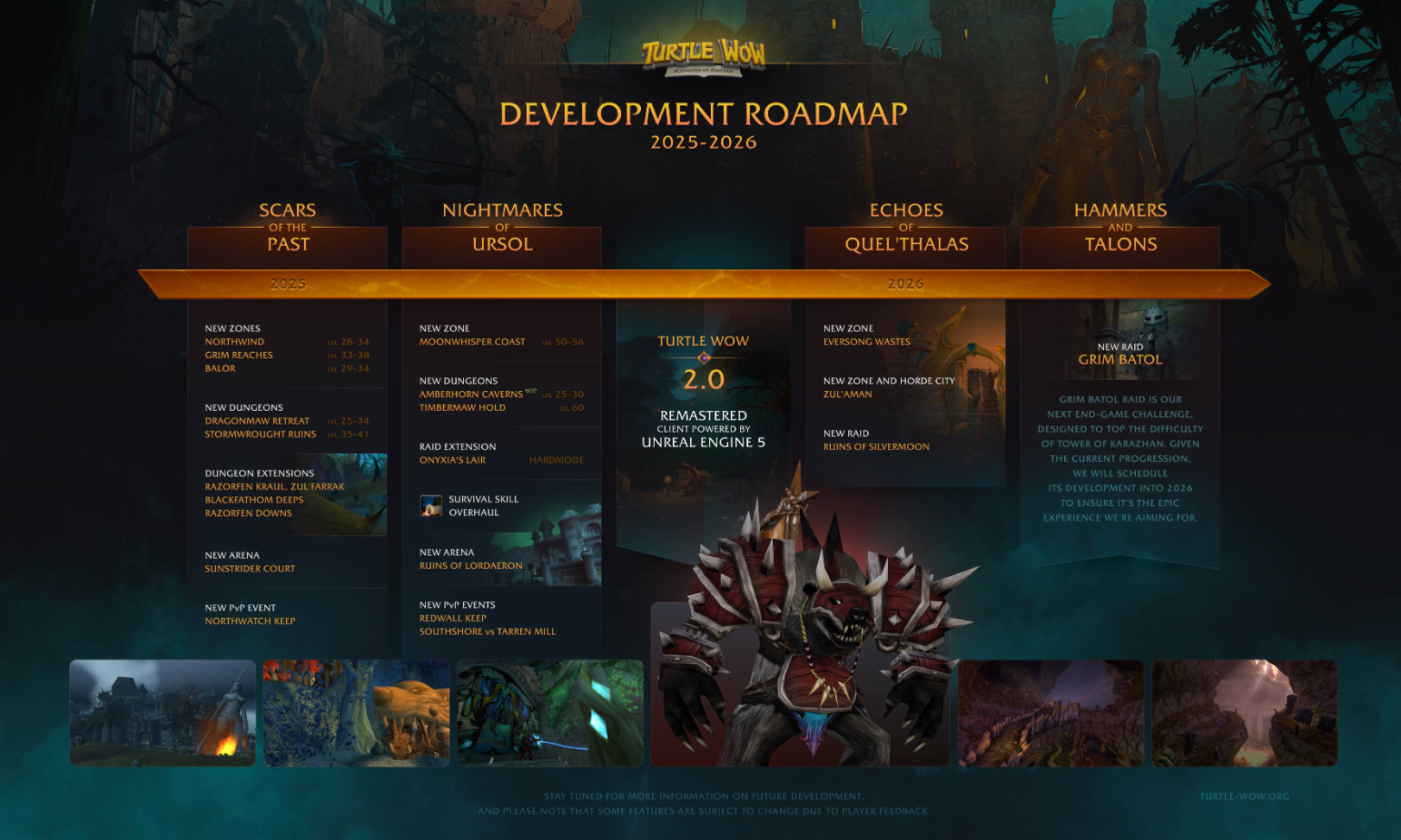 Fargodeep Mine Edition>Recent NewsNightmares of Ursol will release March 20th for Turtle Wow, introducing a bunch of new content to the game and unlocking BWL on Ambershire: https://forum.turtlecraft.gg/viewtopic.php?f=2&t=24129The Emerald Sanctum raid released early on Ambershire and is now available.>Released ServersCrusader-Storm - https://crusader-storm.com/ (TBC)Season of the Crusade - https://seasonofthecrusade.com/ (Vanilla+ / TBC)Ascension - https://ascension.gg/en (BBC+, Classless, Reborn Classic+, Custom Classes/CoA, Epoch)Chromiecraft - https://www.chromiecraft.com/en/ (PVE, progressive)Netherwing - https://stormforge.gg/en (TBC Progressive)Tauri - https://tauriwow.com (WoD on Legion client, Legion content coming soon)Turtle WoW - https://turtlecraft.gg (Vanilla+)Warmane - https://www.warmane.com/ (TBC, WOTLK, MoP)>GuildsTo join a guild, type /who g-"Guild Name" to see who's online, and whisper anyone for an invite.<Poo in the Loo> - Stormforge Frostmourne, crossfaction<gulag> - Tauri, Evermoon, Alliance<Chuckers of Sneed> - Turtle Wow, Ambershire, crossfaction<Full Moon Company> - Turtle Wow, Nordanaar, crossfaction (Ambershire charter guilds <Branded> and <Evil>)>BBC+https://github.com/ascensionhandynotespoi/HandyNotes_Ascension_POIhttps://bronzebeardmaps.pages.dev/>TurtleAll Turtle addons (copy & paste github links on the launcher) - https://turtle-wow.fandom.com/wiki/AddonsMisc - https://database.turtlecraft.gg | https://talents.turtlecraft.gg | https://twow.link/classchanges | https://turtletimers.com>Mods, Tutorials and /wpsg/ Creationshttps://pastebin.com/4Awe3bxX>Previous Thread>>559686014