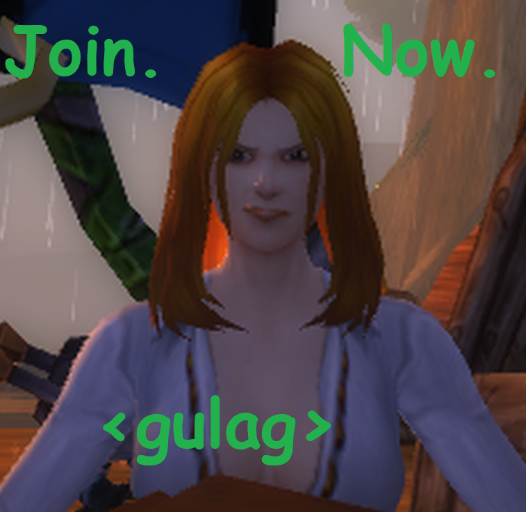 >>560278181You get your ass back there and chitchat in general so I'm not alone! I don't want to go back to boring grindy-ass Turtlewow with the furries and the troons, goddammit!