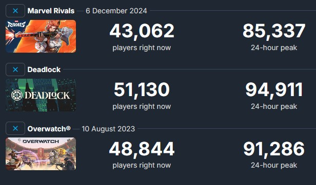 >>560093794I'm honestly impressed with Marvel's numbers during this lull in content. The thing that cracks me up more is that Overwatch is already dipping below Deadlock's numbers. Not a good look, xisters.