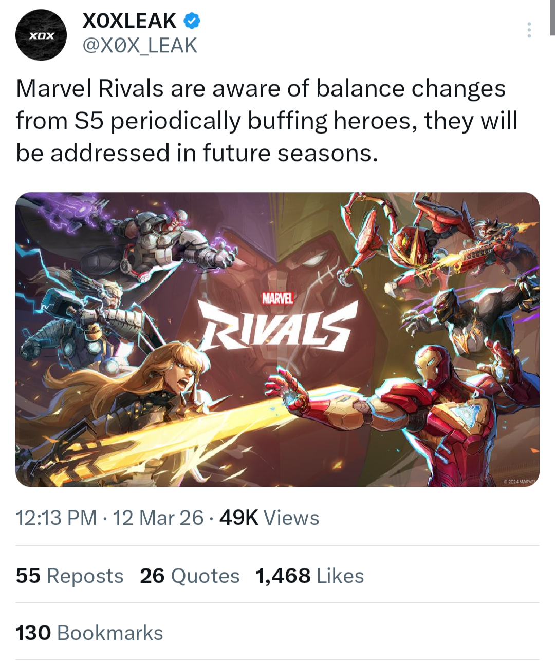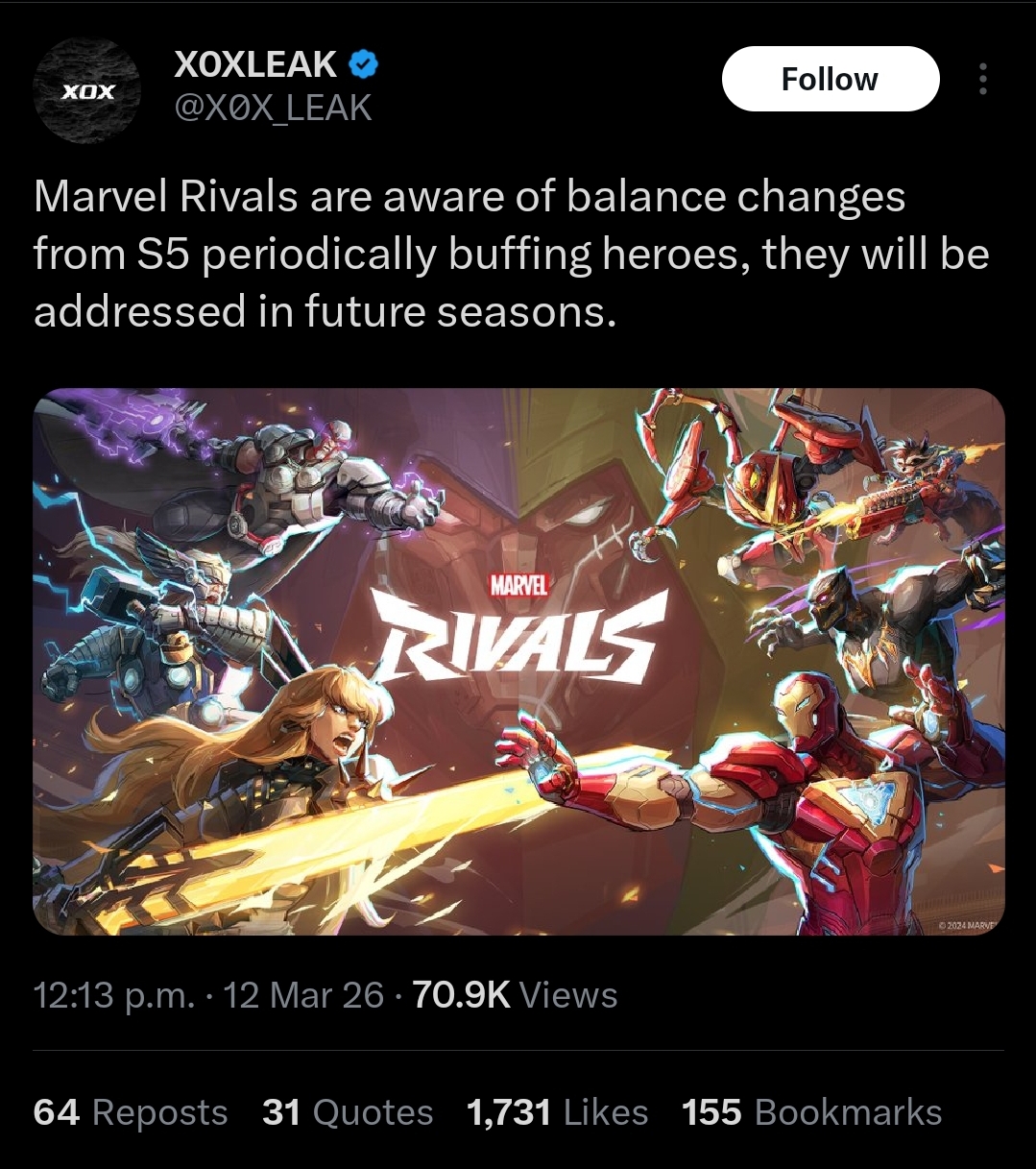 Year of Carol VIII Edition>NewsElsa Bloodstone Character Reveal: https://youtu.be/-o307xgilSADev Vision Vol. 14: https://youtu.be/e12fPPx8-_0Version 20260312 Patch Notes: https://www.marvelrivals.com/gameupdate/20260310/41548_1290394.htmlWedding Wishes for Mr. and Mrs. X event: https://x.com/i/status/2021615210369585274Season 6.5 Roadmap: https://x.com/i/status/2021660509032886284Citizenship of Monster Kingdom Event: https://x.com/i/status/2021313221949362270Map Reveal: Museum of Contemplation: https://youtu.be/AWEtIaKvs5wSeason 6 Battle Pass: Museum Ticket: https://youtu.be/EAQfj_68TEMSeason 6: Night at the Museum Official Trailer: https://youtu.be/Aj53c2Uxrtc>StoreThe Thing's Fear Itself and Daredevil's Born Again Season 2 skins: https://x.com/i/status/2031407298669666551Psylocke's Once-Captive Corsair & Captain America's Cursed Captain skins: https://x.com/i/status/2029738798007886162Phoenix's Seat of Spring and Moon Knight's Eclipse Knight skins: https://x.com/i/status/2023804865076490548Emma Frost's Black Queen of the Marauders and Iron Man's Iron Mariner skins: https://x.com/i/status/2023427159608443189Elsa Bloodstone's Young Blood skin: https://x.com/i/status/2021283027888787955Magneto's Seat of Autumn and Groot's Mecha-Flora skins: https://x.com/i/status/2018353919567483073Angela's Ace of Spades and Emma Frost's Queen of Diamonds skins: https://x.com/i/status/2016179585172361629Thor's Boogie Bolt and Luna Snow's Disco Pop skins: https://x.com/i/status/2013642855898624502>LinksHero Hot List: https://marvelrivals.com/heroes_data/Guides & News: https://marvelrivals.gg/Tracker Resources: https://rivalstracker.comMobalytics Page: https://mobalytics.gg/marvel-rivalsFANDOM Wiki: https://marvelrivals.fandom.com/Checkpoint: >>559928203