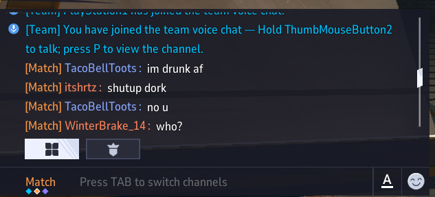 >>560253647Eh, I always start out with Im drunk af.I also can crash out at my teammates when they do dumb shit like expect me to solo tank or heal>>560257692I tried to VC and was muted