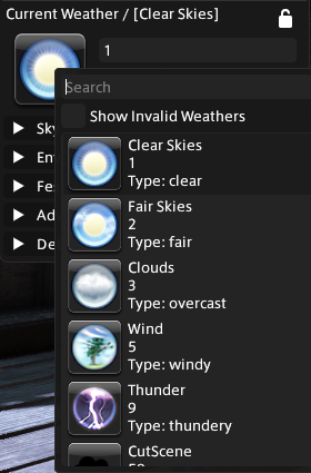 anyone know how to make brio change the weather please? normally i know the brio weather is janky and i preset the weather with /weatherman before entering gpose.but i forgot today and now i'm hours into a pose and stuck with cloudy, lightning-filled skies when i want a cheery blue sky. please help me, when i click any of these weathers, literally nothing happens. i can only change the time of day.