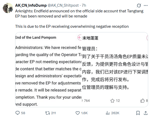 Previous thread: >>560085580>"Old Deep Water Dies, by Rising Tide It Is Denied"[YouTube] Arknights: Endfield [Old Deep Water Dies, by Rising Tide It is Denied] Version Trailer (embed) [Version Trailer][YouTube] Arknights: Endfield Dev Log | Optimization Progress & Version Preview now live. (embed) [Dev Log Stream]>Official Websitehttps://endfield.gryphline.com/en-us>Official EN X (News)https://x.com/AKEndfield>DEV Comm (Developer Updates)https://endfield.gryphline.com/en-us/news/2662>Tangtang PVs[YouTube] 『アークナイツ:エンドフィールド』オペレーター戦闘紹介 - タンタン (embed)[YouTube] Arknights: Endfield Operator Combat Demo: Tangtang (embed)>Chartered Headhunting ScheduleMarch 12th to March 29th --- "River's Daughter", (Tangtang)March 29th to April 14th --- "Wolf Pearl", (Rossi)ENDED --- "Hues of Passion", (Yvonne)>SKPORT Daily Sign-inhttps://game.skport.com/endfield/sign-in?header=0&hg_media=skport&hg_link_campaign=tools>Twitch Dropshttps://endfield.gryphline.com/special/third-party-binding?channel=twitch>Reward CodesDACHIEFSEESUIMAWAVERIDAH>Wikishttps://wiki.skport.com/endfield (Official)https://perlica.moehttps://warfarin.wiki/enhttps://endfield.wiki.gg/>Blueprint Guideshttps://talospioneers.com/en>Stickershttps://drive.google.com/drive/folders/13KH3L6QPIKkVH7pBddv4uxwmwJsnOtklhttps://drive.google.com/drive/folders/1OuVtjv1k-9c3M6n7d4PX3CGG5bkwH04ahttps://drive.google.com/drive/folders/1AStB8bzFk3lSwMwczWPkFYCBrZe0vHOghttps://drive.google.com/drive/folders/1yS0lqUhxf8tBRtpDFfCU1y16IS2sSeF7>Fri/end/sSubmit your info, /end/min:https://forms.gle/Fo7BhZMKaKqiWyL19View other /end/mins:https://docs.google.com/spreadsheets/d/1YtxiDss0hgEQhLlZgpfzyGrJrzUcqDzOS9T6IH-BiVc/edit?usp=sharing