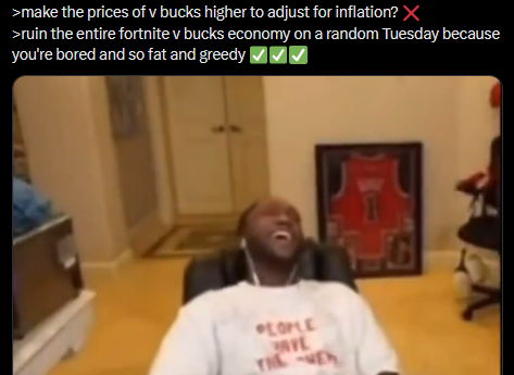 >>560120362I love how people immediately think it's the collabs ruining Fortnite and not them spending on their money on shit that doesn't improve the game. Instead of reducing money given to comp players or creative - they had to make the game more expensive for everyone. Inflating the price of a virtual currency meanwhile our wages aren't increasing. I'm sure that'll work out well and won't completely tank the companies reputation after the worst season in years