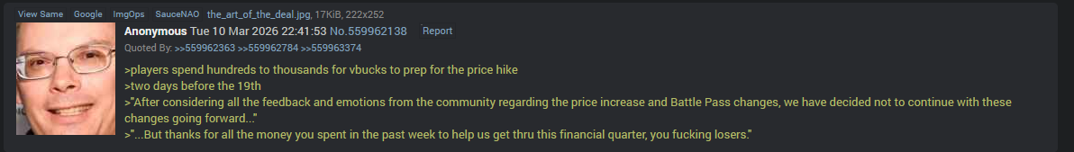 >>560118802yeah the statement was>"we hear you but we need this money to fight tim's legal battles and fund his failed metaverse GET EXCITED FOR NEW PRODUCT PLEASE"'It's so bad grifters are even latching on to how bullshit this all is, Expect a bunch of israel owned shilllbots to shill the new season to try and quell the criticism for a month until the money pile runs out.
