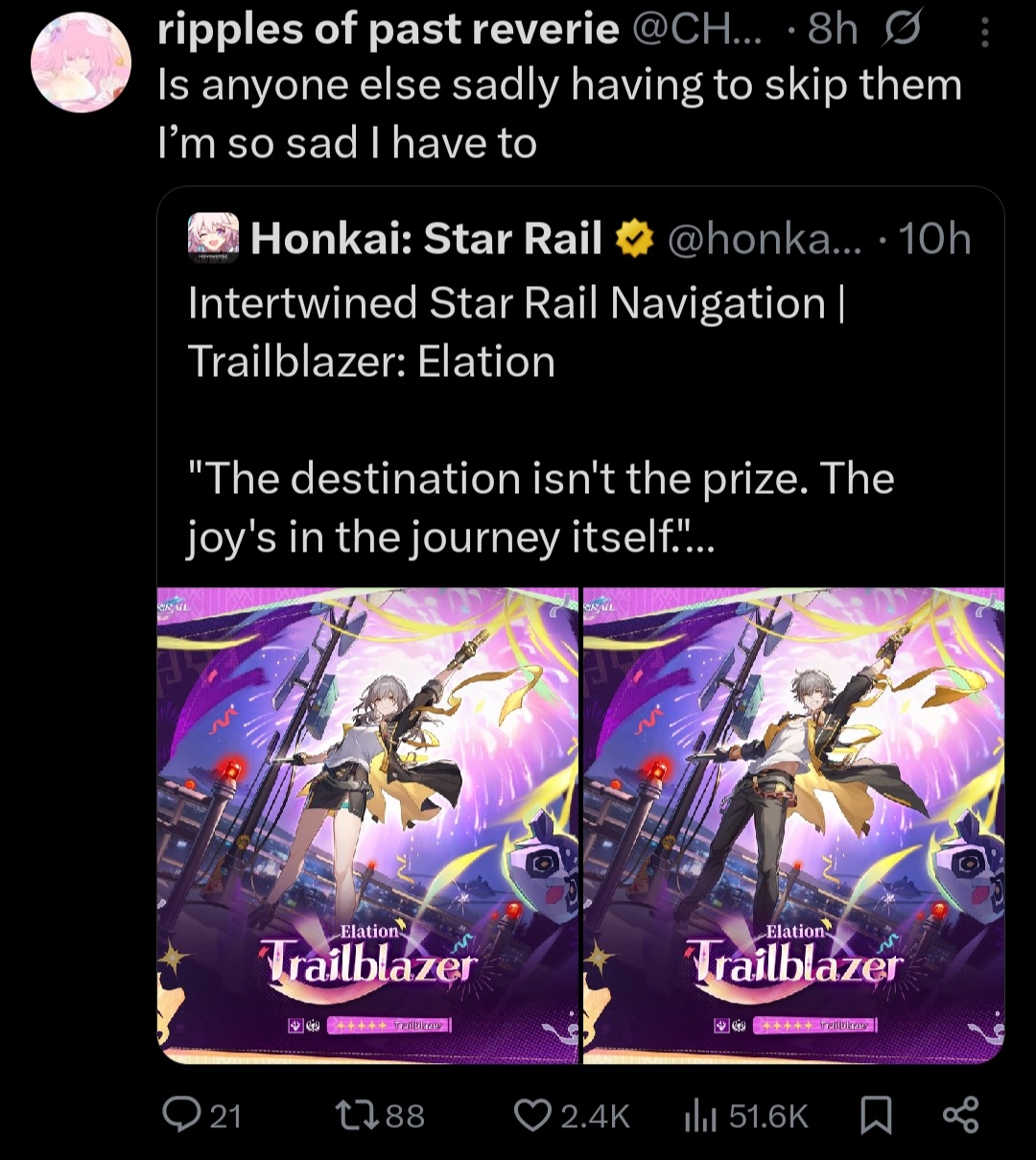 Previous: >>560097680>Version 4.1 "Unraveled for Daybreak" Special Program will be officially released on 2026/03/13 at 19:30 (UTC+8)https://www.youtube.com/watch?v=TgGPAPo02pM https://www.youtube.com/watch?v=H97-304rAxs >Download - https://hsr.hoyoverse.com/en-us/home>4.0 Preview Page - https://act.hoyoverse.com/sr/event/e20260206version-nwlbwa/index.html>Version 4.0 Trailer: "No Aha at Full Moon"https://www.youtube.com/watch?v=2hH0hILcWPs https://www.youtube.com/watch?v=EMT6GmhDiBk >Sparxie Character Trailer: "Ravings"https://www.youtube.com/watch?v=NU6J88t4luM https://www.youtube.com/watch?v=AdUoc-nSB94 >I'll Never Forgive Star Railhttps://www.youtube.com/watch?v=7ia3b_9-znQ https://www.youtube.com/watch?v=gI-W8r-TWUM >Current Character Banners: Sparxie, Yao Guang, Cerydra, Rappa, Sparkle + Pela, Hanya, Qingque - https://www.hoyolab.com/article/44017918>New Drip Marketing:>Silver Wolf LV.999 (5* Imaginary Elation) - https://www.hoyolab.com/article/44129793>Evanescia (5* Physical Elation) - https://www.hoyolab.com/article/44140823>Elation Trailblazer (5* Lightning Elation) - https://www.hoyolab.com/article/44152517>Redeemable Codes - https://hsr.hoyoverse.com/gift4T28RJM4MS3BSub2SparxieMH5KCBGF3AAT45QSTARRAILGIFT>/hsrg/ Tools & Resourceshttps://rentry.org/hsrg-resources-14>/hsrg/ Thread Templatehttps://rentry.org/hsrg-thread-template-14