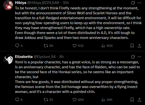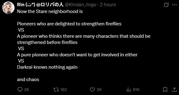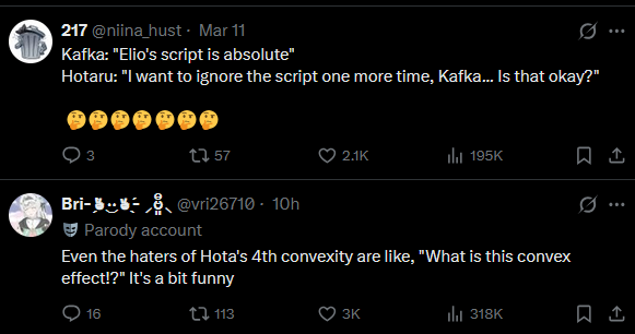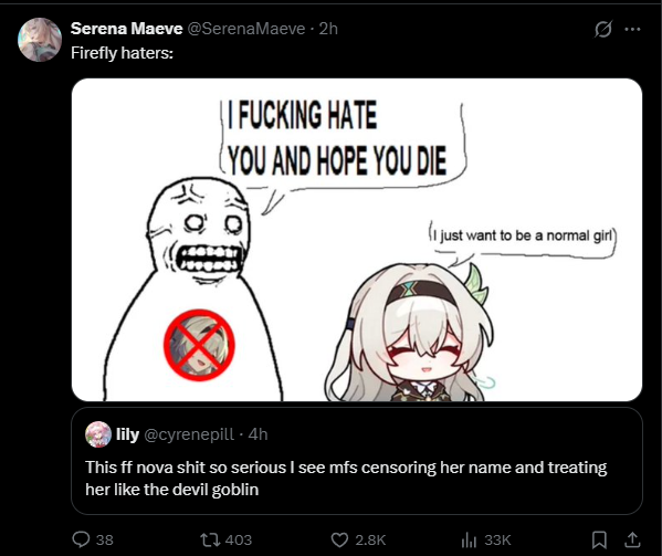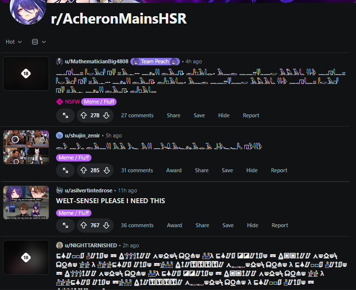 AI Analysis>Top Schizo Topics Ranked (only the ones that actually qualify)>Sparxie Footcam Streamer Empire (92/100)The absolute champion. Anons spin an entire alternate-universe backstory where Sparxie is a degenerate foot-fetish OnlyFans-style streamer with: donation timers on her “footcam”, plushie-stepping tease ASMR members-only streams, psychological conditioning to milk whales“she’s definitely mischievous enough to have a timer… casually mentioning her foot cam is always on”>“Kill Shillfly, Behead Shillfly” Firefly Obsession (88/100)Violent copypasta-level meltdown:“kill shillfly. behead shillfly. roundhouse kick shillfly on concrete”claims Hoyo is memory-holing her after multiple reruns, that she’s a failed waifu, and that new characters are being artificially propped up to bury her. The hatred is so cartoonishly over-the-top it loops back into conspiracy.>Elation Path Year-Long Shill Conspiracy + “KEK KEY POW” (75/100)Anons insist the devs are artificially dragging Elation dominance for a full year (“1 year vs 3 months You don’t hate Elation enough”), bricking every other path, and that DDD was their “biggest regret.” >Fofo Psyop (68/100)Chain starts with “Fofo is ugly NO ONE likes Fofo STOP POSTING PICTURES OF FOFO” instantly accused of being a psyop to trick people into posting her spirals into “she’s garbage as a healer” vs “everyone loves Fofo.” The denial + psyop flip is pure 4chan brainrot.>Stelle “Canonically Autistic” + Futa-Coding Self-Insert Conspiracy (65/100)Two separate but equally deranged micro-chains:“female MC Stelle is canonically autistic” dropped with zero evidence.“Look up Stelle porn with other female characters. It’s all futa… self-insert character that’s primarily played by insecure men has a cock in most fanart… she’s futa coded.”I love the idea of the Fofo Psyop