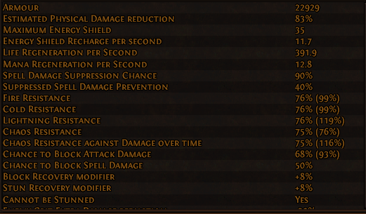 Just look how hcfags do it on poeninja. Most of them have a shield, use evasion/es pieces (sometimes with grace on eternal blessing) and have stuff like extra max res.