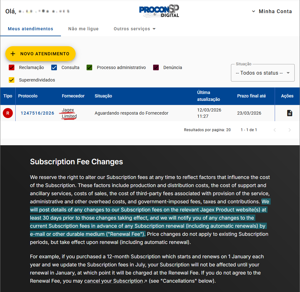 I opened a formal complaint against Jagex with my local Consumer Protection agency, for Breach of Contract. It was quick and easy, I encourage others to do this too.Like NationalGlove highlighted, Jagex's sudden price increase breaks their own Terms and Services and is a breach of contract: https://www.reddit.com/r/2007scape/comments/1rroldt/jagexs_subscription_terms_conditions/Why? Because it was quick, easy, and I should have 30 days to subscribe with the old prices if I so desired. In, yup, Brasil, the annual prices went up by 70%. If I had access to the older prices, as I had in the past, and chose to subscribe with those older prices, it would be effectively a 40% discount.It's a long shot here, but I suspect that other consumer protection agencies, especially those in Europe, might give it a shot, especially if multiple users file reasonable complaints.They have 10 days to respond, and if PROCON fails, I will sue... in small claims court. It's something.Best-case scenario, I get to waste Jagex legal's time, have the lower price as an option, and maybe they back off for other regions as well. Worst-case, I wasted like what, 30 minutes online? Totally worth it.Come on Jagex, you at least gotta screw us playing by the rules. Not cool.