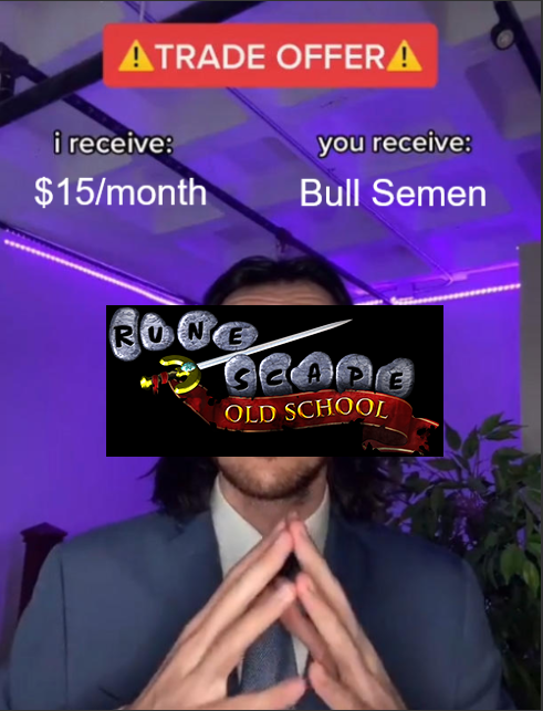 The thing is, prices are localized for a reason, in Brazil minimum wage is 1499 R$ (after taxes), so in order to afford a full year of Runescape Membership for 3 characters, you'd have to spend an entire month's worth of minimum wage in Brazil (to be fair, you'd be left with 239 Reais, wich is enough to buy 2 entire Pizzas in Sao Paulo! Just eat half a slice a day and you got food and runescape for the entire month, what else do you need??)While OSRS charges 45 R$ monthly, WoW charges even less than that, with a monthly value of 39,90 R$, and Tibia, the other popular MMO, charges you 56 R$ FOR OVER 20 CHARACTERS.By the way? OSRS is the only MMO title that doesn't offer 3 and 6 months subscription plans anymore, i wonder why that is?After doing all this thinking, and considering all the money we now have to dish out to play the game we love, i realized something...IF I'M PAYING 25 DAYS WORTH OF AN AVERAGE BRAZILIAN SALARY FOR THIS STUPID GAME WHY DON'T I HAVE A SERVER TO PLAY ON YOU GREEDY BASTARDS?? GIVE US OUR SERVERS YOU RATS, 130 PING IS UNNACEPTABLE, YOU MADE THIS HOBBY EXPENSIVE, NOW FIGURE IT THE FUCK OUT.
